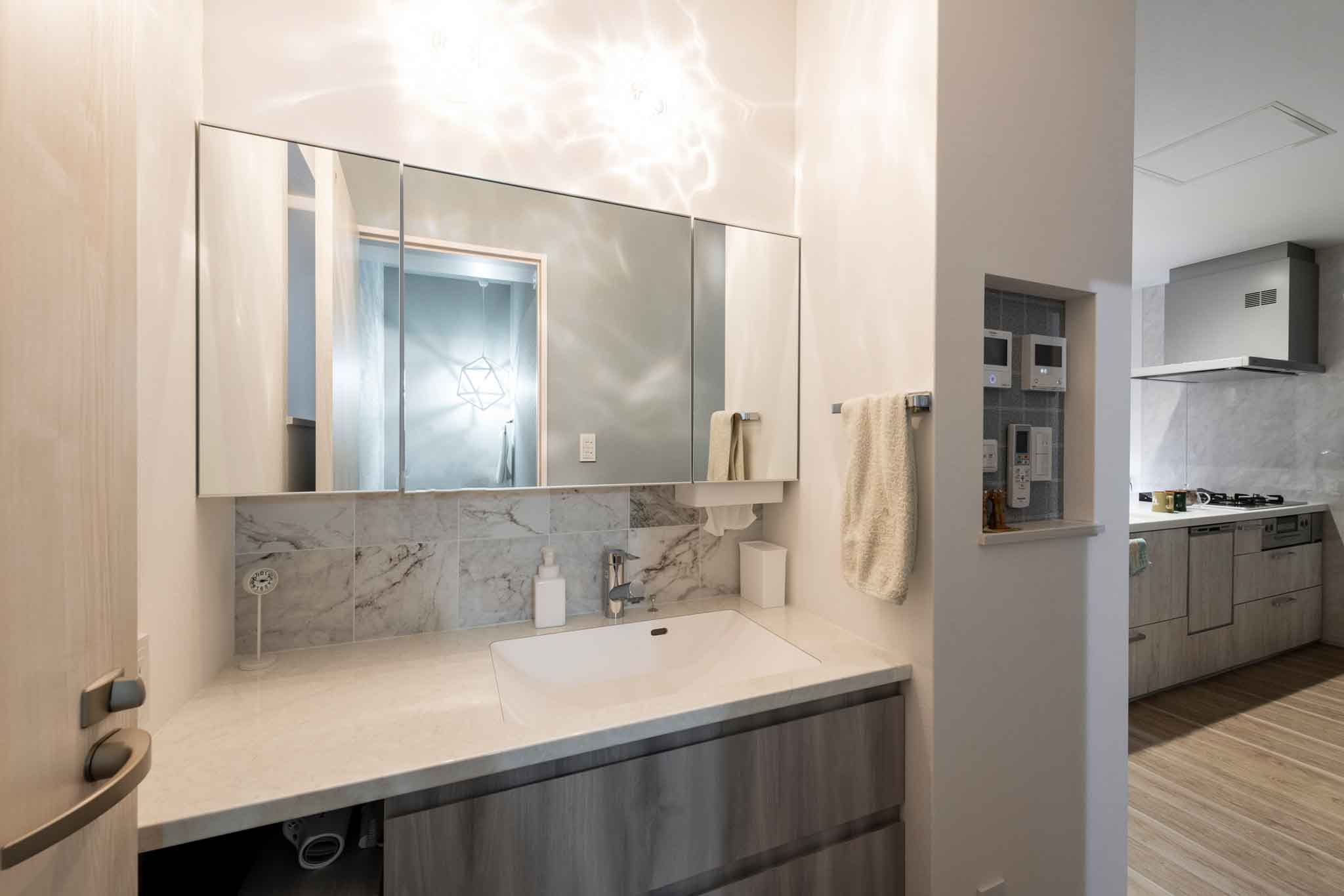 洗面コーナー:スペースの有効活用と使い勝手を考慮し、キッチンに連動する形で、奥にトイレ、洗濯室、ユーティリティ、浴室を機能的に配置しました。洗面台は二人同時に使えるワイドサイズにデザインされています。