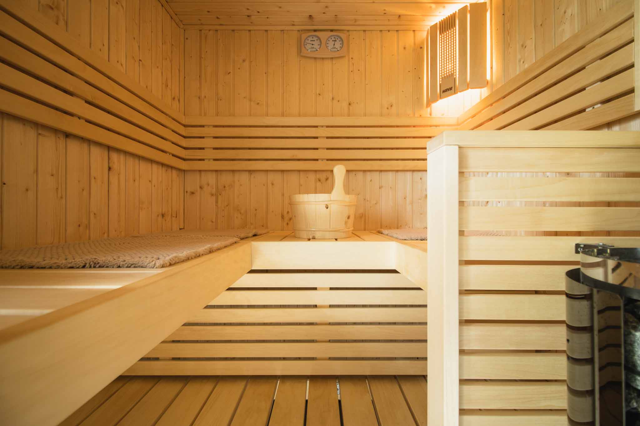 サウナ:オーナー様のご要望で実現した待望のホームサウナは、開放感のあるガラス扉とコの字形のベンチを備えています。ハルビア社のサウナストーブを採用し、施設クオリティの本格的な体験が楽しめます。