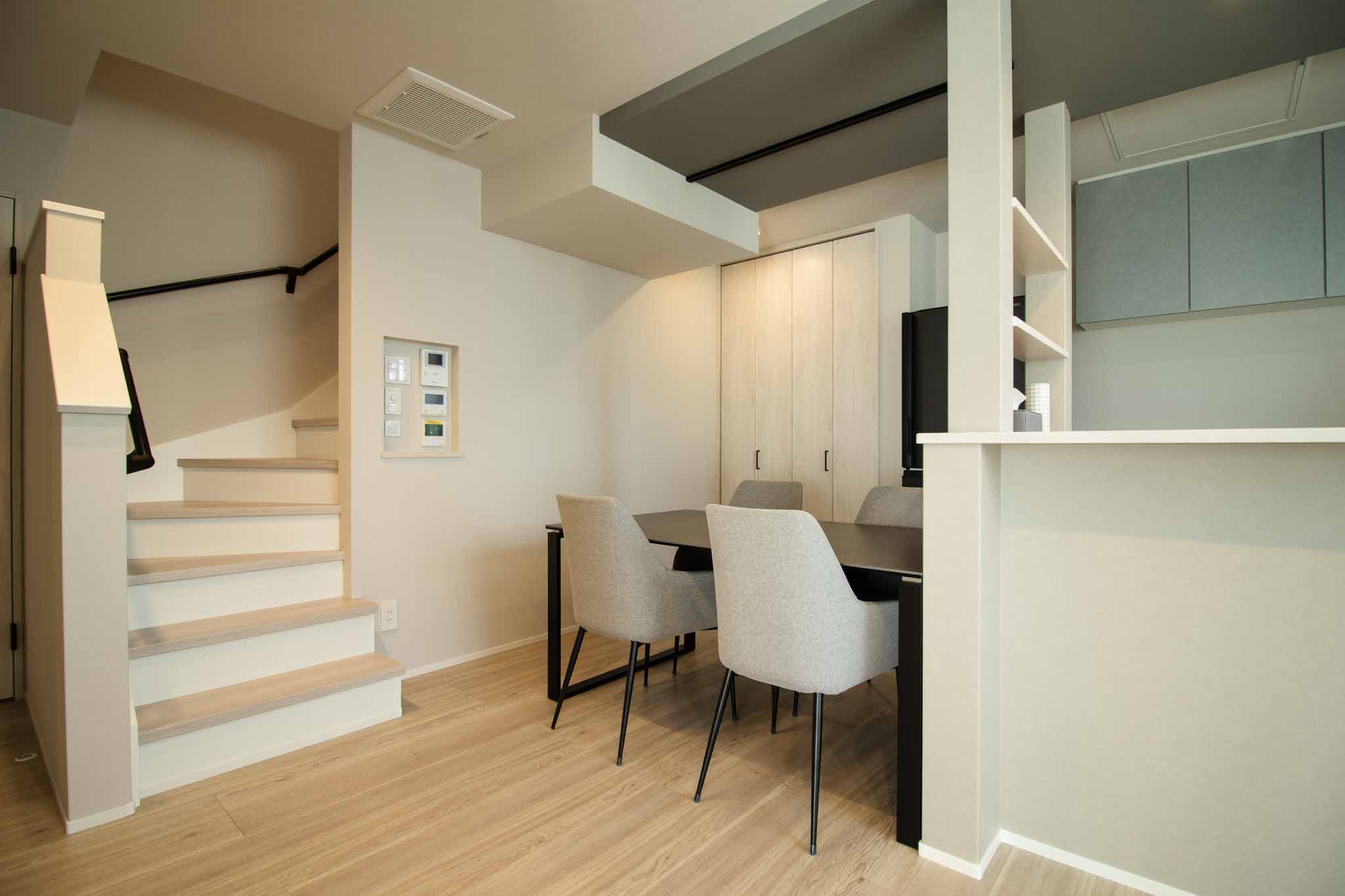 ダイニング・キッチン:リビングの対面に位置するダイニング・キッチンはコンロ、調理スペース、シンク、ダイニングテーブルーブルが横並びのレイアウトで、効率的な動線を確保しています。