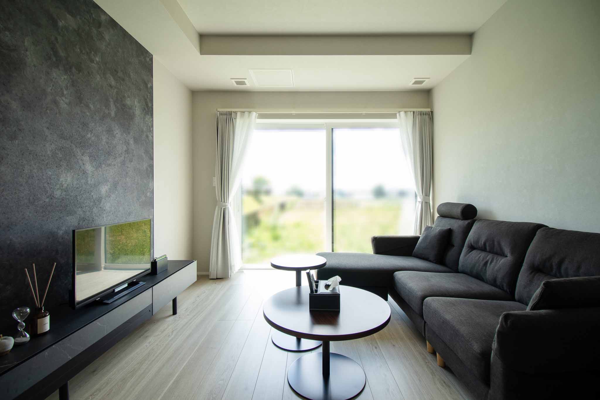 リビング:南面の大きな窓から自然光がたっぷりと差し込む開放的な空間です。熱損失が懸念される大きな窓でも、ダブル断熱とトリプルサッシの採用により、冬は暖かく、夏は涼しい空気をしっかり保ちます。