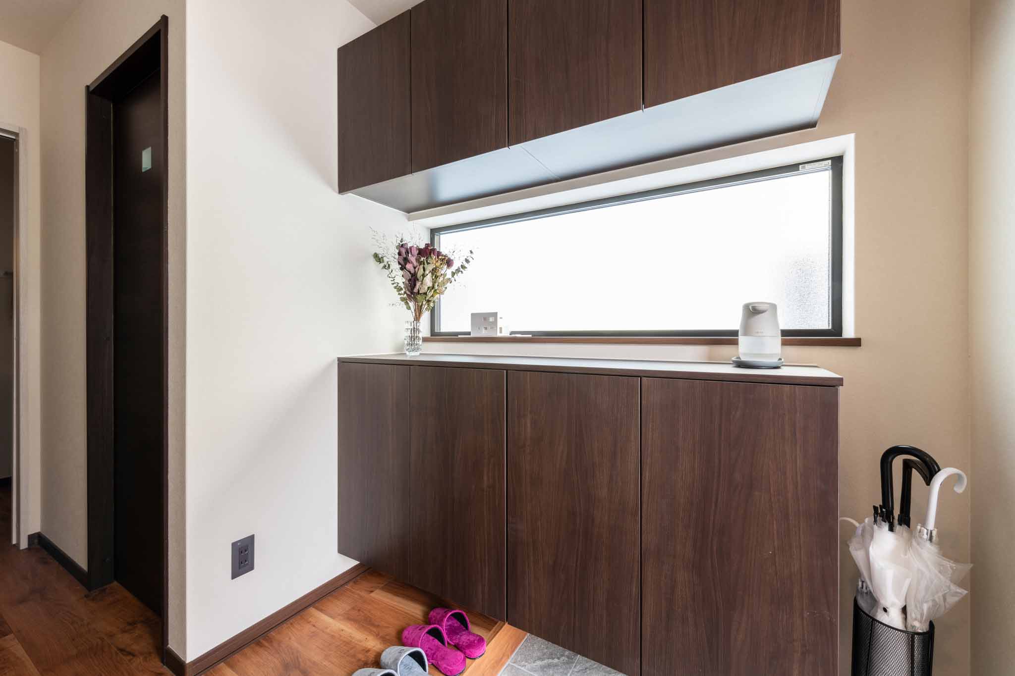 玄関:シューズボックスは上下に分かれており、中央に開口部を設けることで明るく開放的な玄関となっています。さらに、コートや傘などの季節用品も収納できるシューズクローゼットが完備されており、玄関をいつもすっきりと整えることができます。