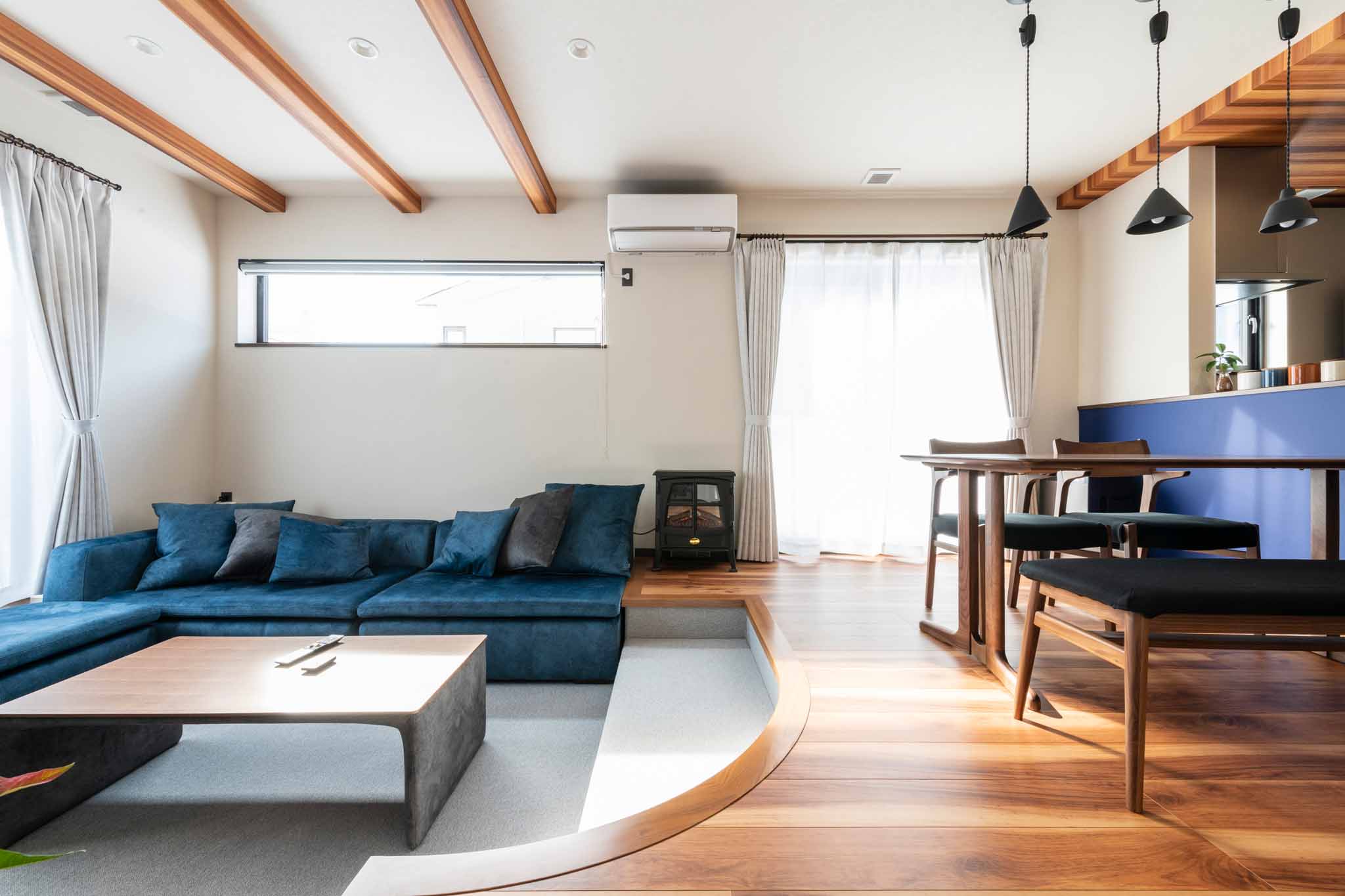 リビング:段差を設けたサンクンリビングは、床を下げることで天井高が増し、広々としたLDKにメリハリを生んでいます。カーペットのリビングエリアとフローリングのダイニングエリアが、空間に変化とリズムをもたらします。