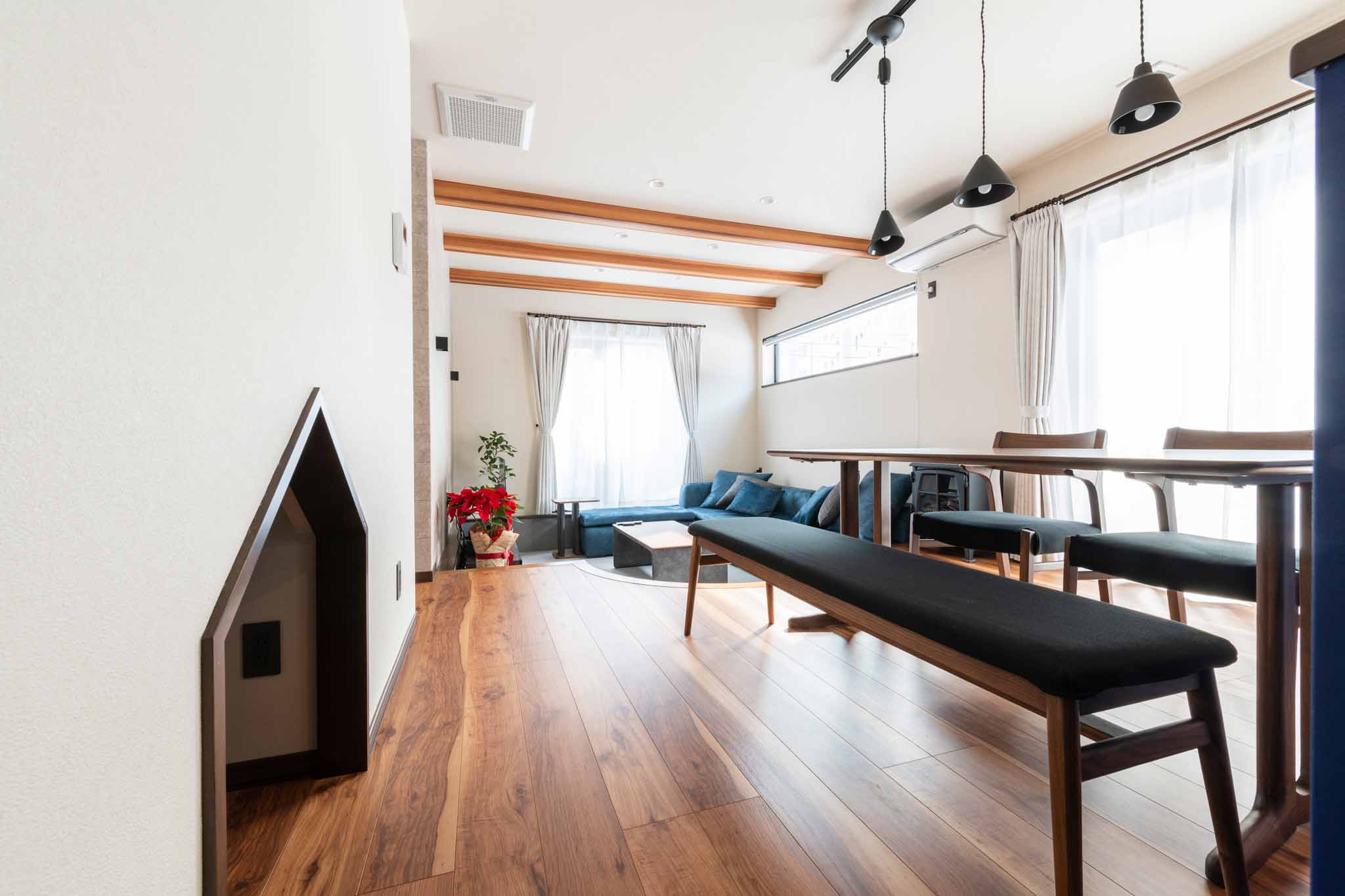ペットスペース:ご夫婦が犬を飼うことを考え、ダイニングの脇の階段下にはペットスペースを設けました。このように、細部まで計画された住まいは、住む人のライフスタイルを豊かにします。