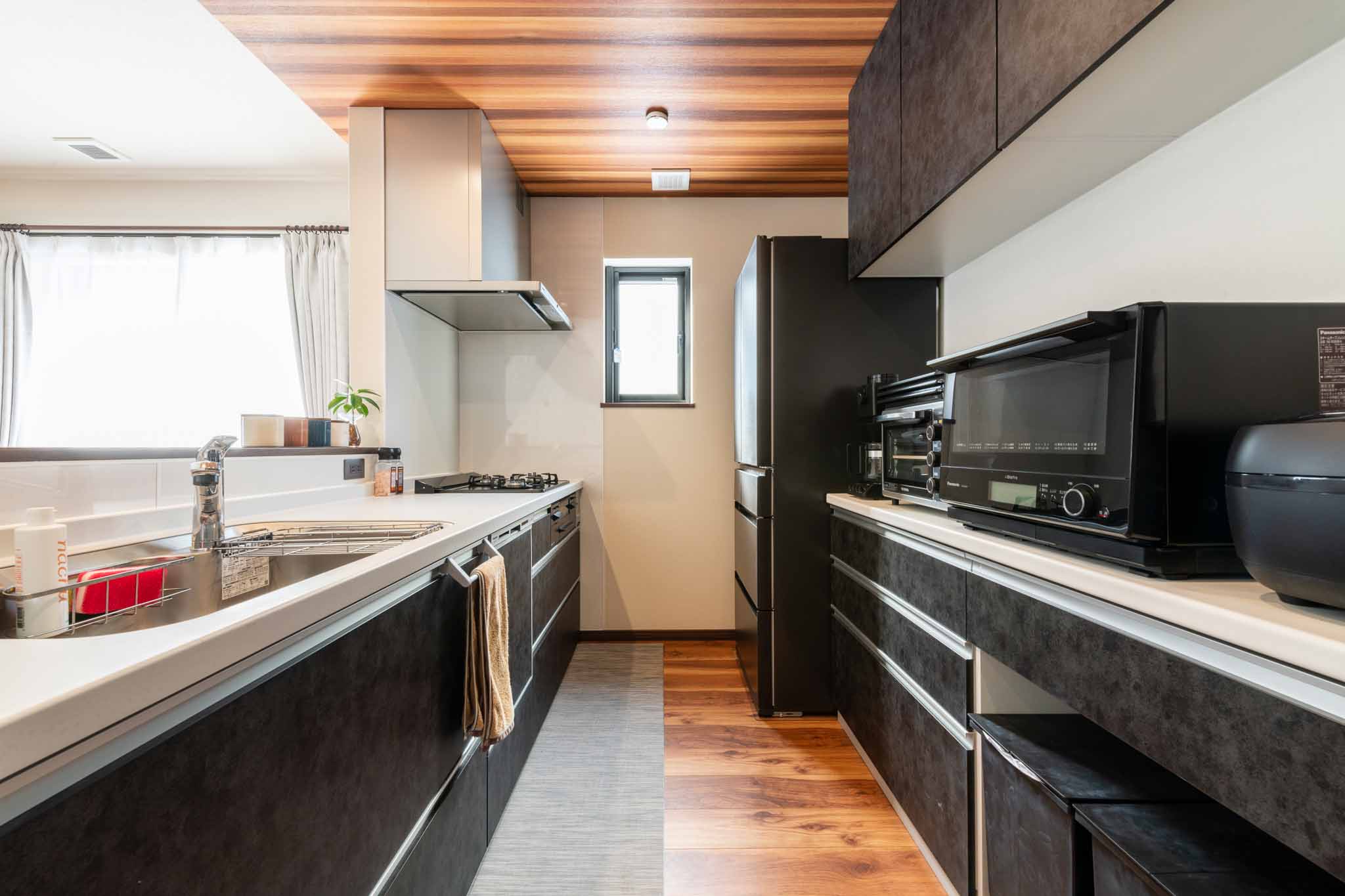 キッチン:ブラックを基調としたキッチンは、落ち着いた雰囲気を醸し出します。キッチンの背後には整理整頓しやすいカップボードとパントリー兼ファミリークローゼットが配置されており、収納スペースも充実しています。
