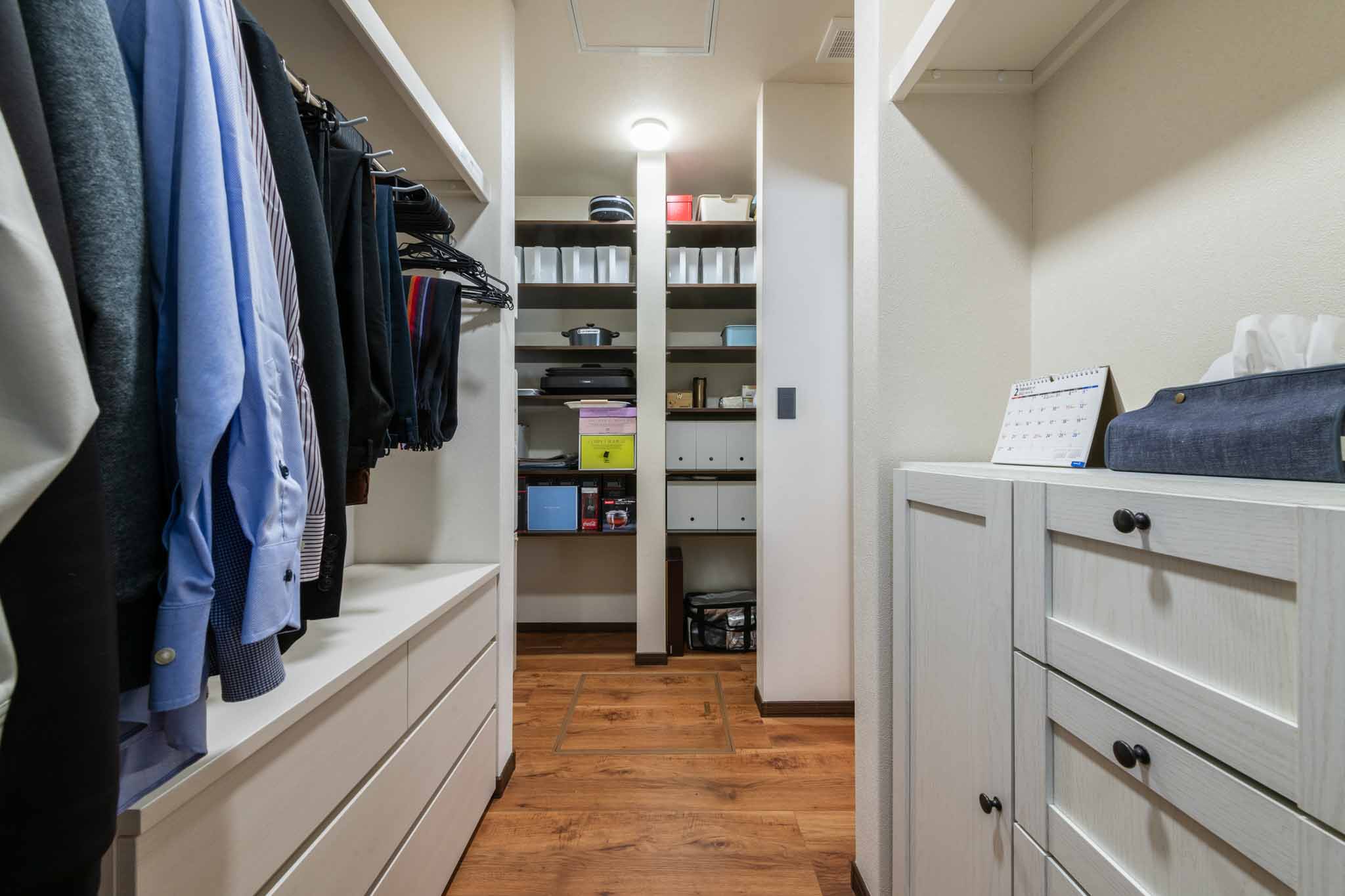 ファミリークローゼット:入り口近くには整頓しやすいパントリーが設けられており、家事動線が良く、使い勝手の良い設計。料理や家事が楽しくなる空間です。