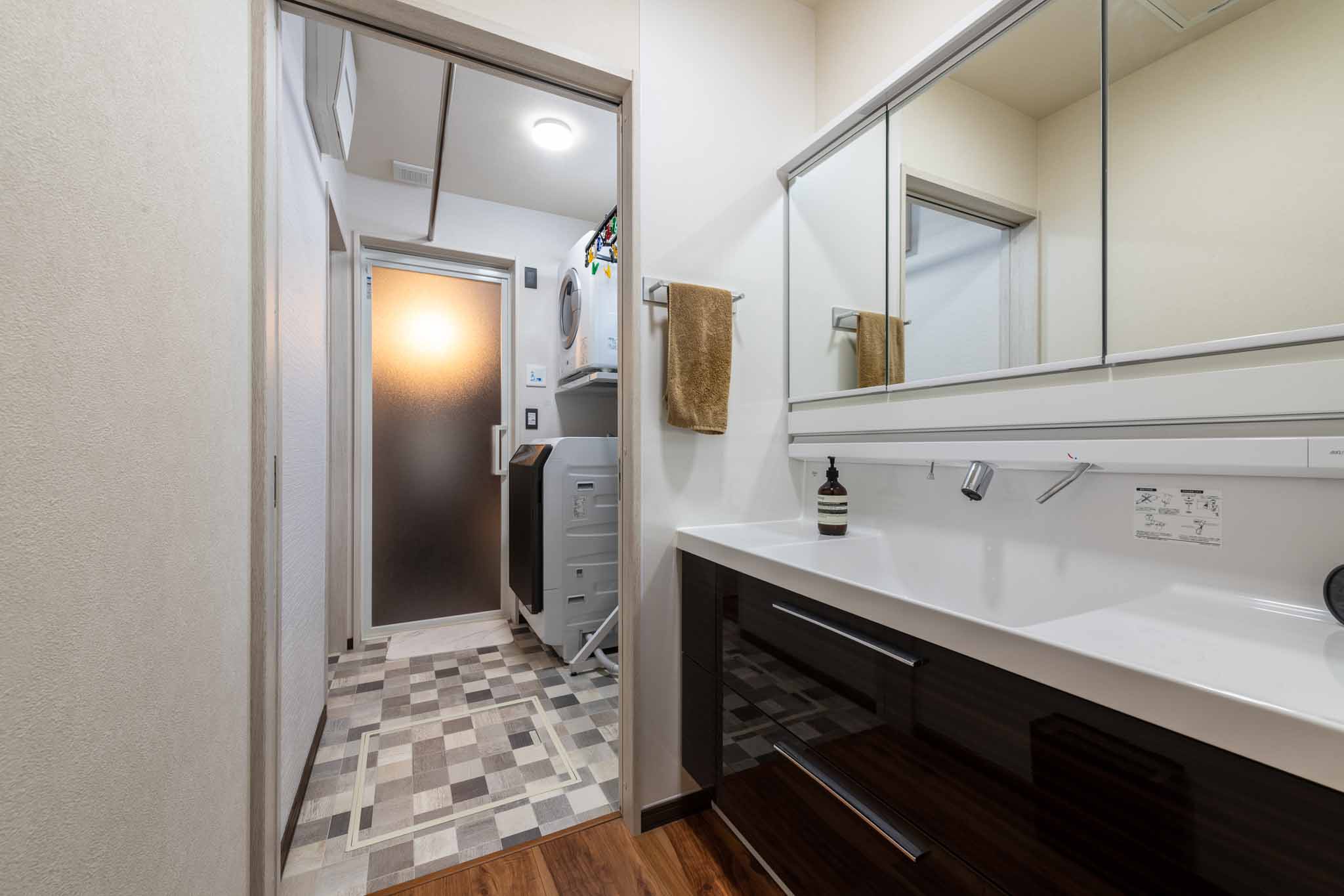 ユーティリティ:独立式の洗面化粧室は上下に収納が完備されており、いつもスッキリとした空間を保てます。隣には脱衣室を兼ねたランドリールームがあり、天気に左右されず一年中安心して利用できます。