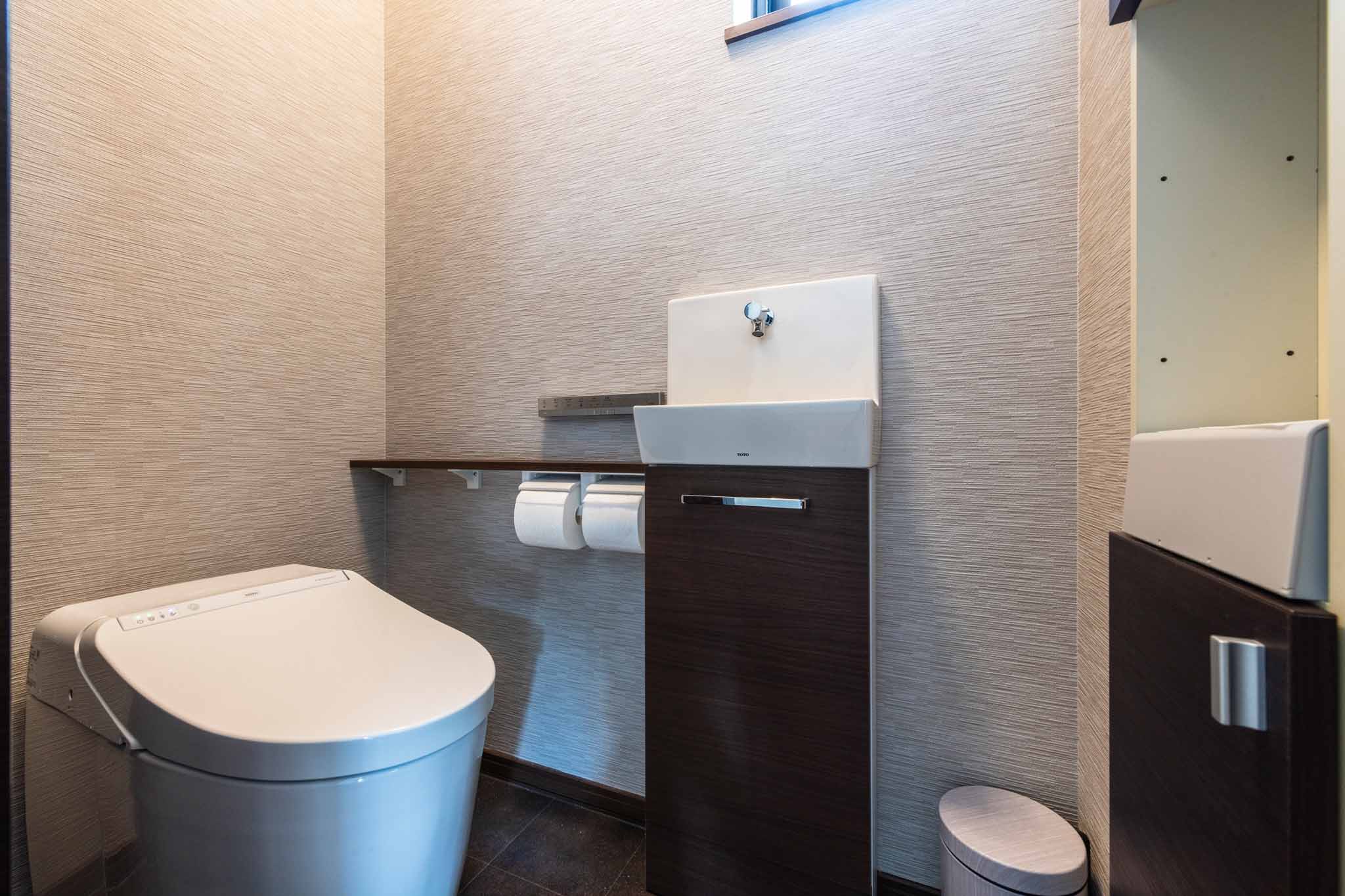 トイレ:落ち着いた色調とシンプルなデザインが、清潔感を引き立てます。収納スペースも確保されており、トイレットペーパーや清掃用具などをすっきりと収納できます。