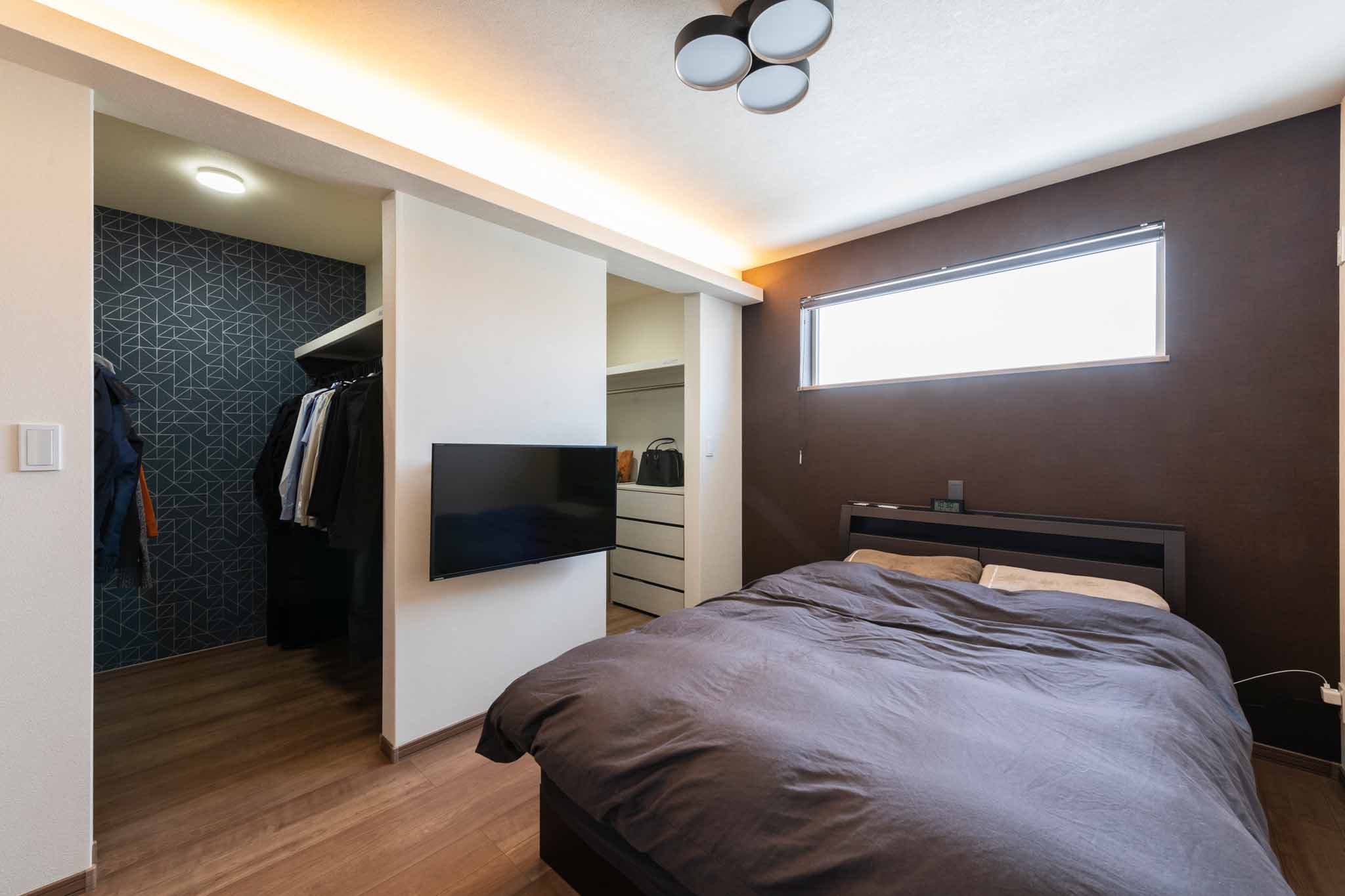 寝室:2階のベッドルームには、夫婦それぞれ専用のウォークインクローゼットを設置。十分な収納スペースがあり、衣類や荷物の整理がしやすく、快適な生活をサポートします。