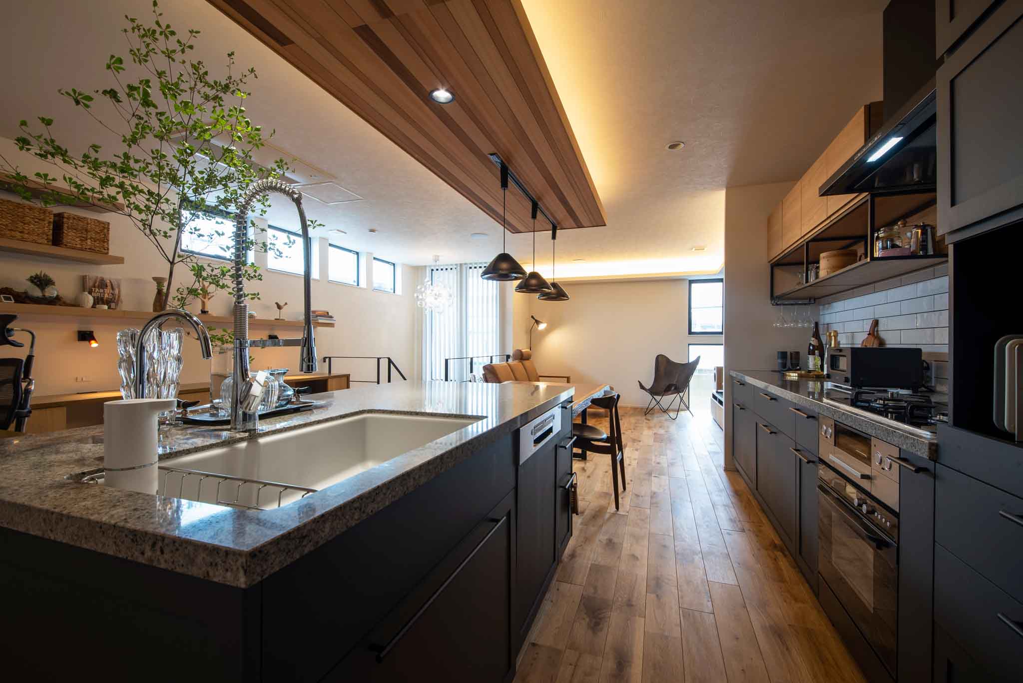 2Fキッチン:アイランド型キッチンに食洗機を設置し、壁側にはビルトインタイプのガスコンロや電子コンベックを設置した、見た目にも美しい機能的な二の字型のキッチン。