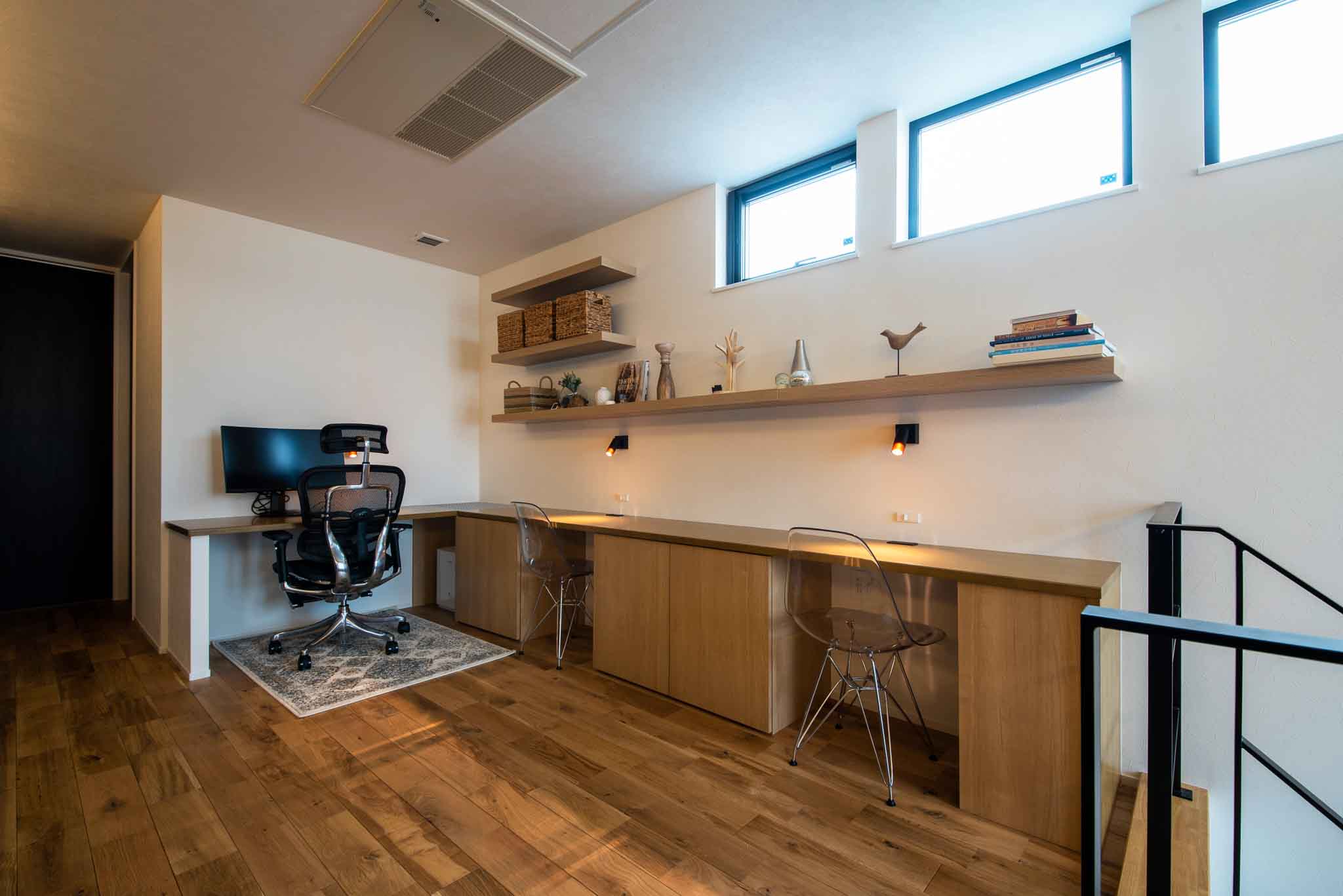 2Fワークスペース:2Fホールを活用したワークスペースは、ご主人の仕事場。将来はお子様の学習スペースとしても活用できます。