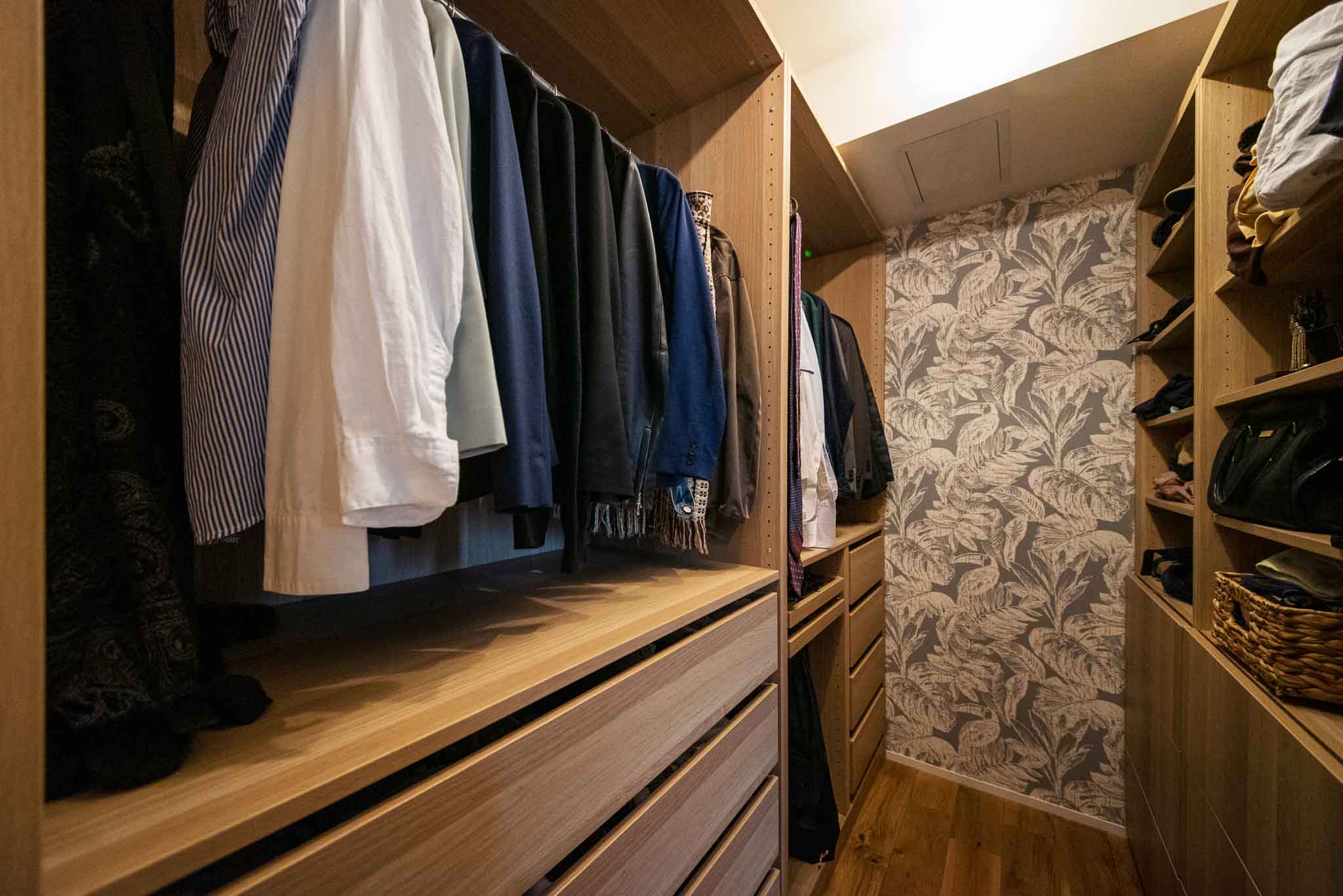 ウォークインクローゼット:壁二面にピッタリと収まった機能的で美しい収納棚。床から天井まで、スペースを有効的に活用しています。