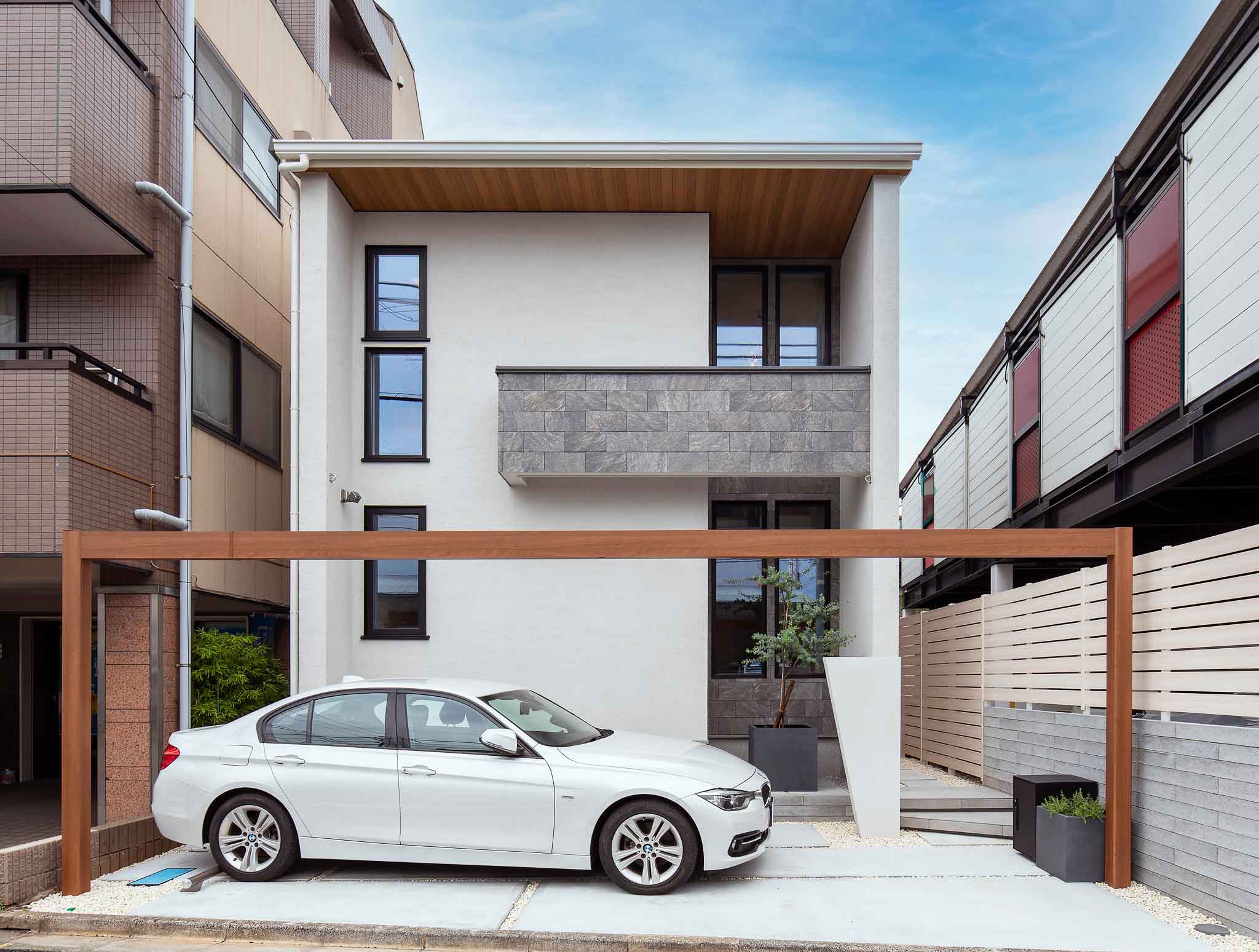 外観:道路に面した側に縦ラインで窓を設置。右手奥の玄関にも自然光が入るよう工夫しました。