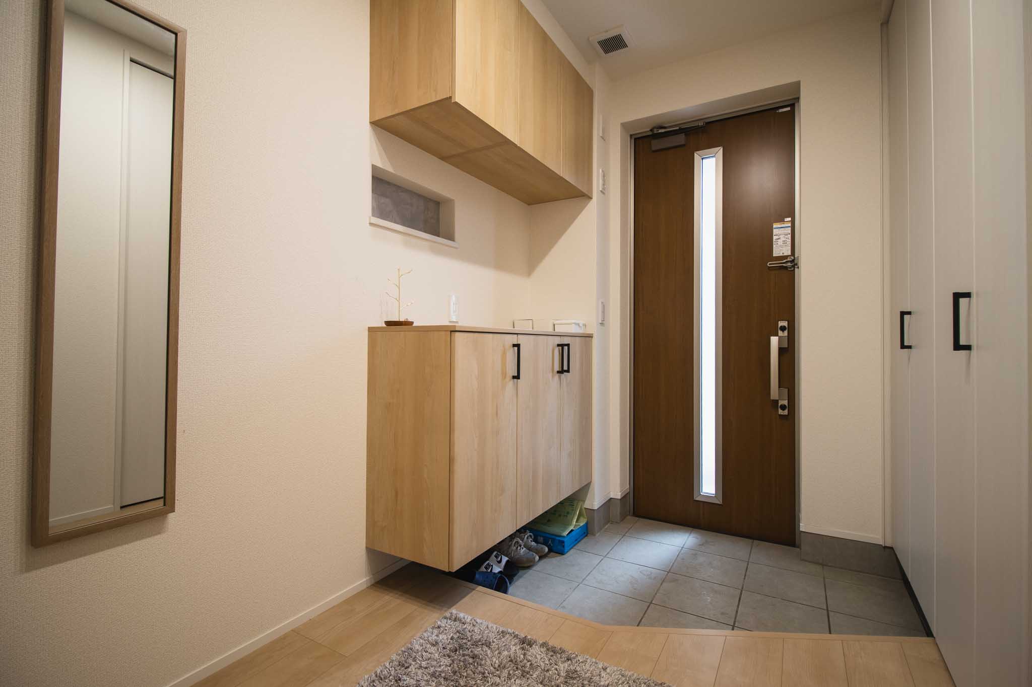 玄関:二の字型の玄関収納とシューズクローゼットを備え、収納力は抜群です。玄関収納にはフロートタイプを採用しており、下部に靴を置けるだけでなく、お掃除もしやすいのが特徴です。