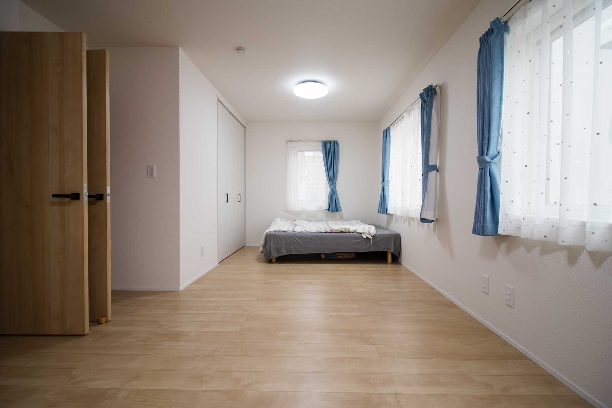 2F洋室:将来2部屋に分けることを想定した11.8帖の洋室。それぞれに扉と収納があり、子供の成長に合わせてフレキシブルに利用できます。