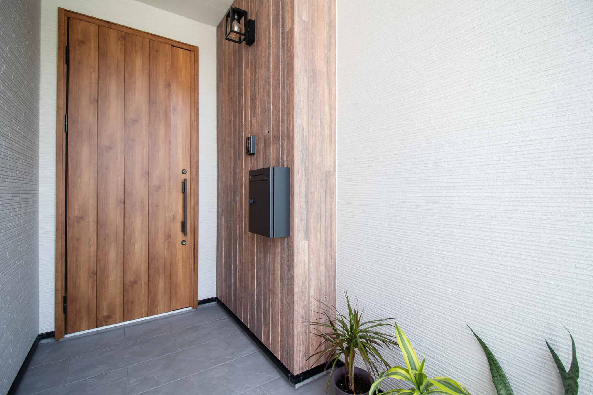 玄関ポーチ:玄関ポーチは、グレーのタイルとマキアートパイン柄の木目サイディングを使用し、自然と調和したデザインです。道路から玄関ドアが見えない配置で、プライバシーにも配慮されています。