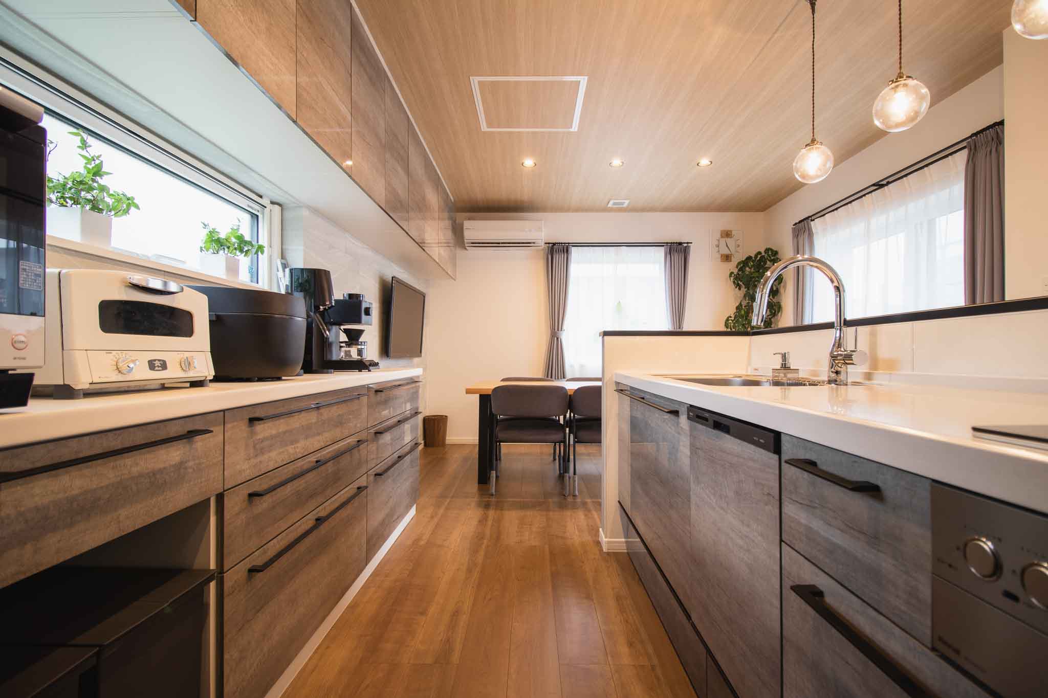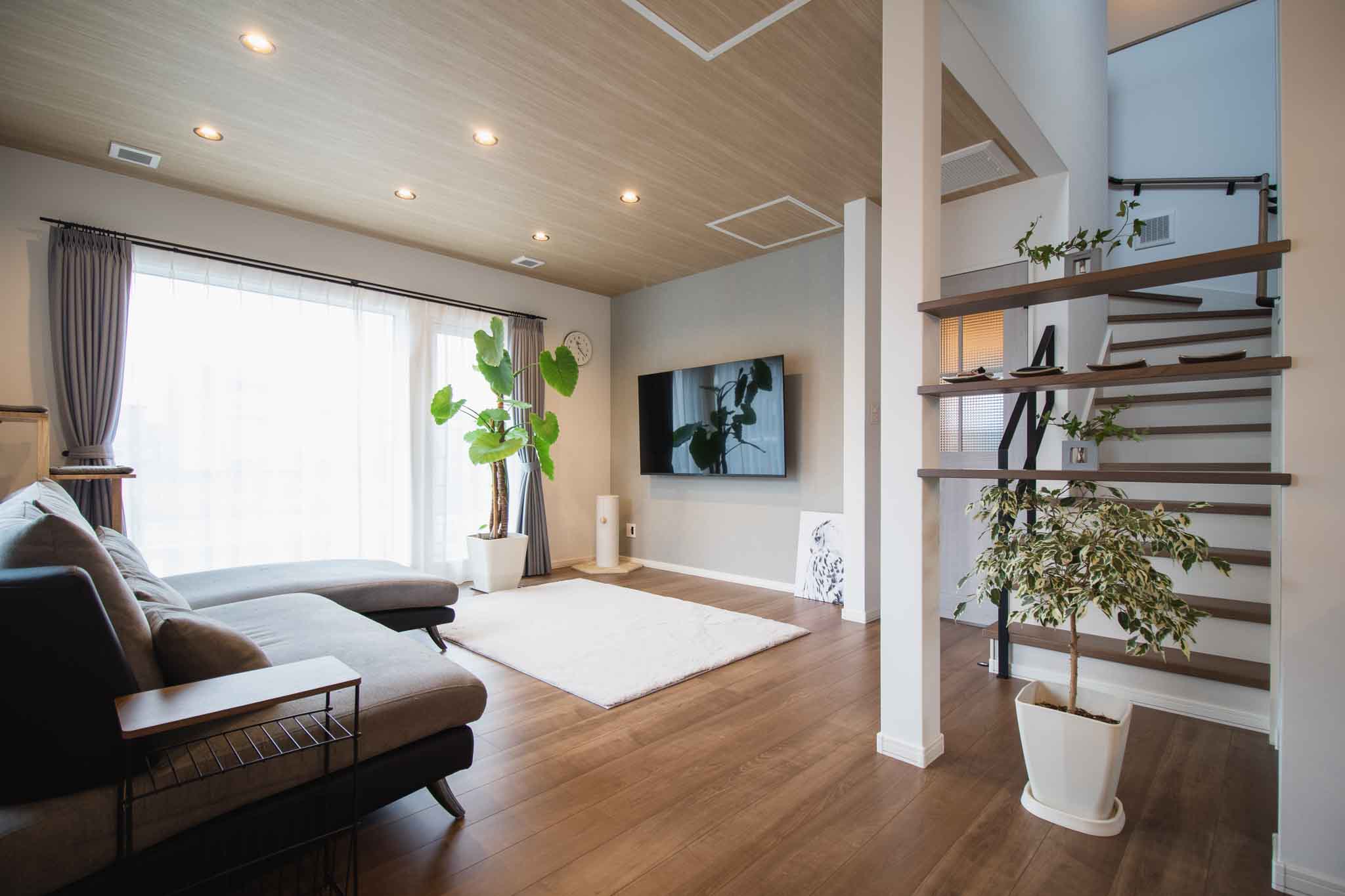 LDK:22.8帖の広々としたLDKは、木目調のフローリングと天井が北欧テイストを演出。グレイッシュなアクセントクロスと対面キッチン、横並びのダイニングが家事効率と家族のコミュニケーションを高めます。