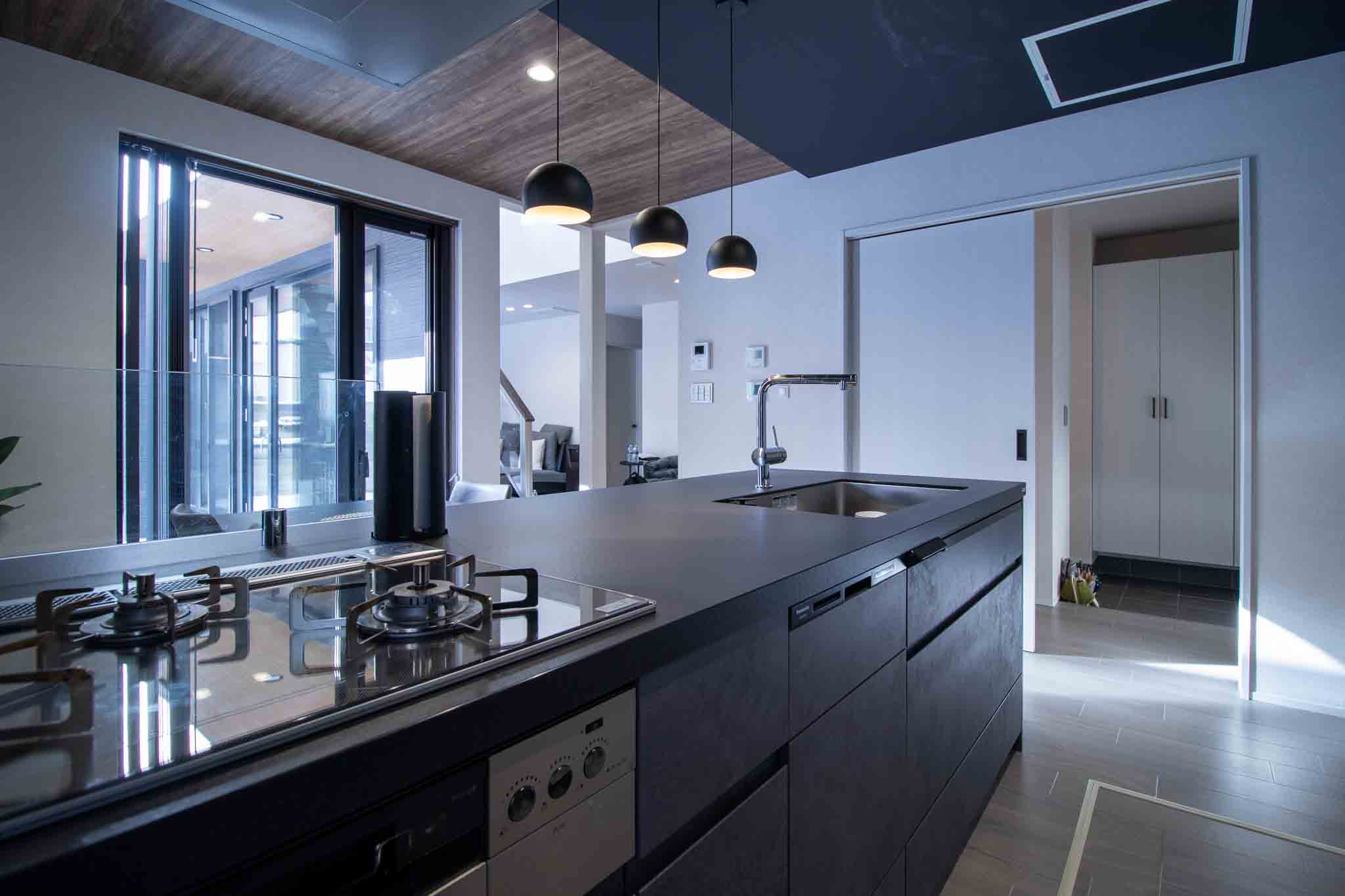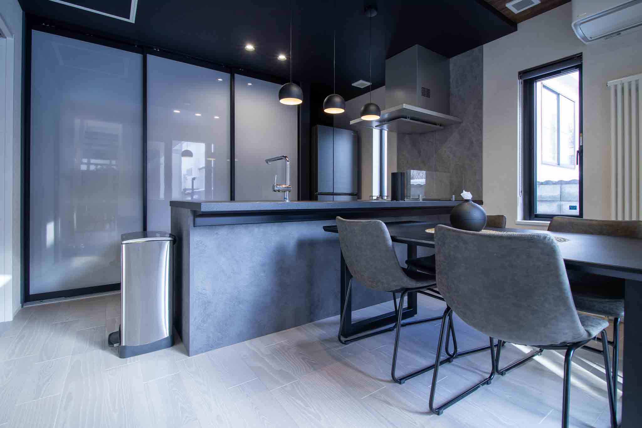 ダイニング・キッチン:9.9帖のダイニング・キッチンは、折下げ天井とスタッコグレーのオープンキッチンが特徴です。大きな収納スペースも備えており、調理器具や食器をすっきりと収納できます。