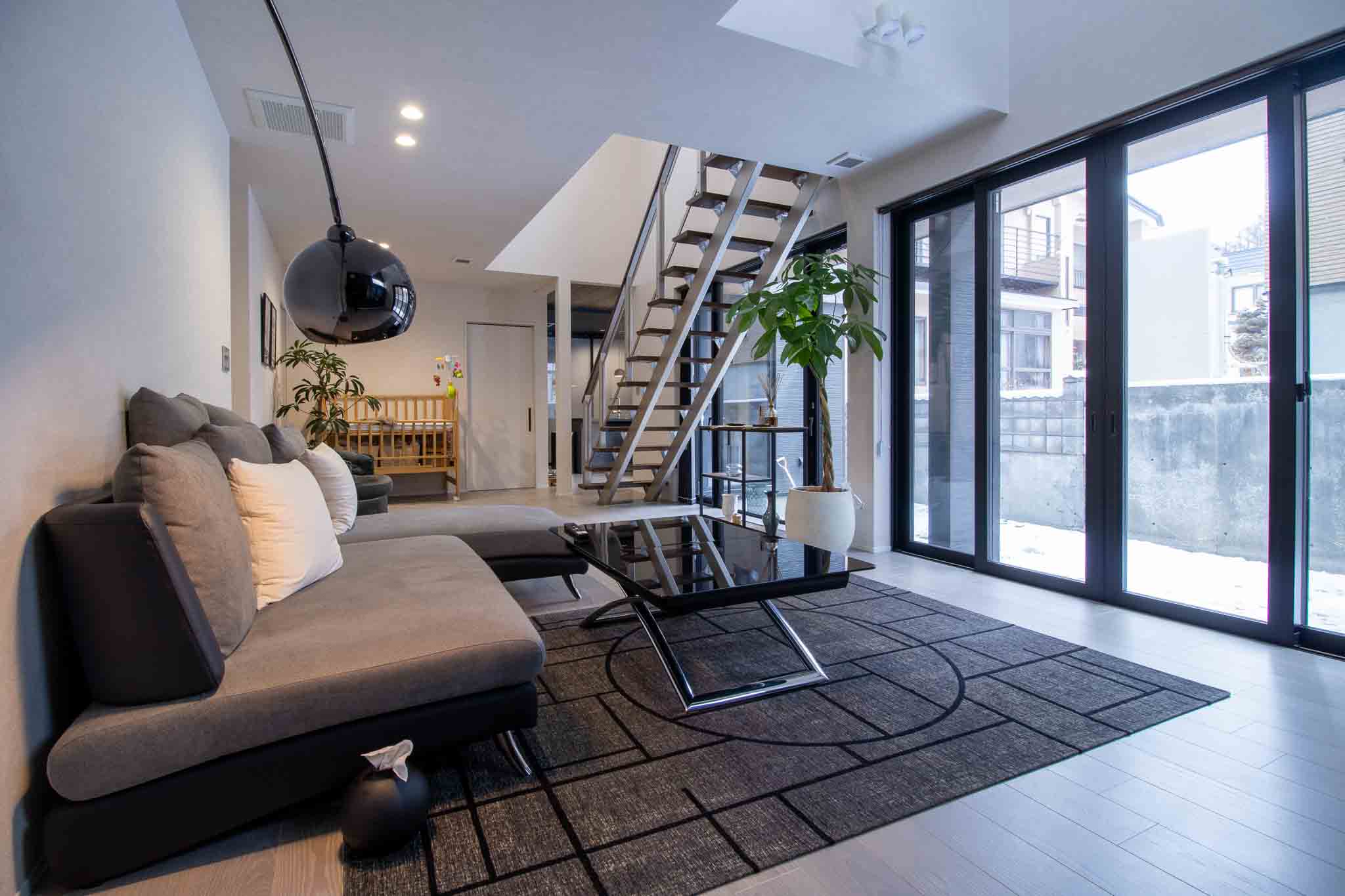 階段:オープン階段はリビングを広く見せ、吹き抜けと大きな窓からの自然光で明るく開放的な空間を作ります。