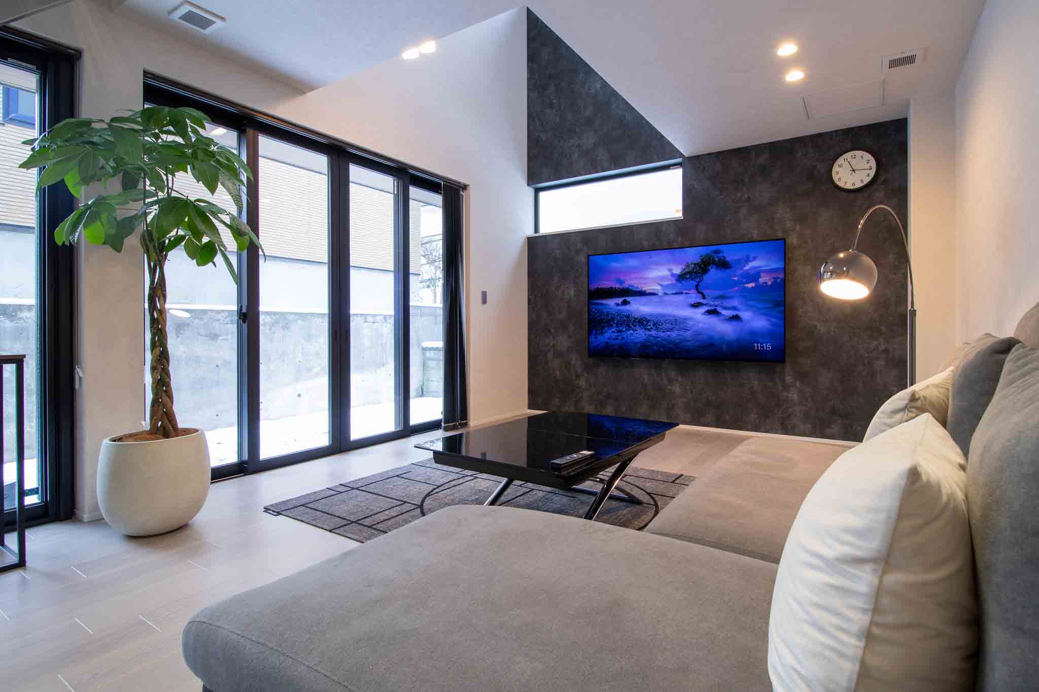 リビング:広々とした15.7帖のリビングは、2箇所の吹き抜けとオープン階段により、圧倒的な開放感を実現しています。大きな窓から自然光がたっぷりと入り、明るく居心地の良い空間を提供します。また、ブラックのアクセントクロスがシックな雰囲気を演出し、スタイリッシュなリビングを作り上げています。