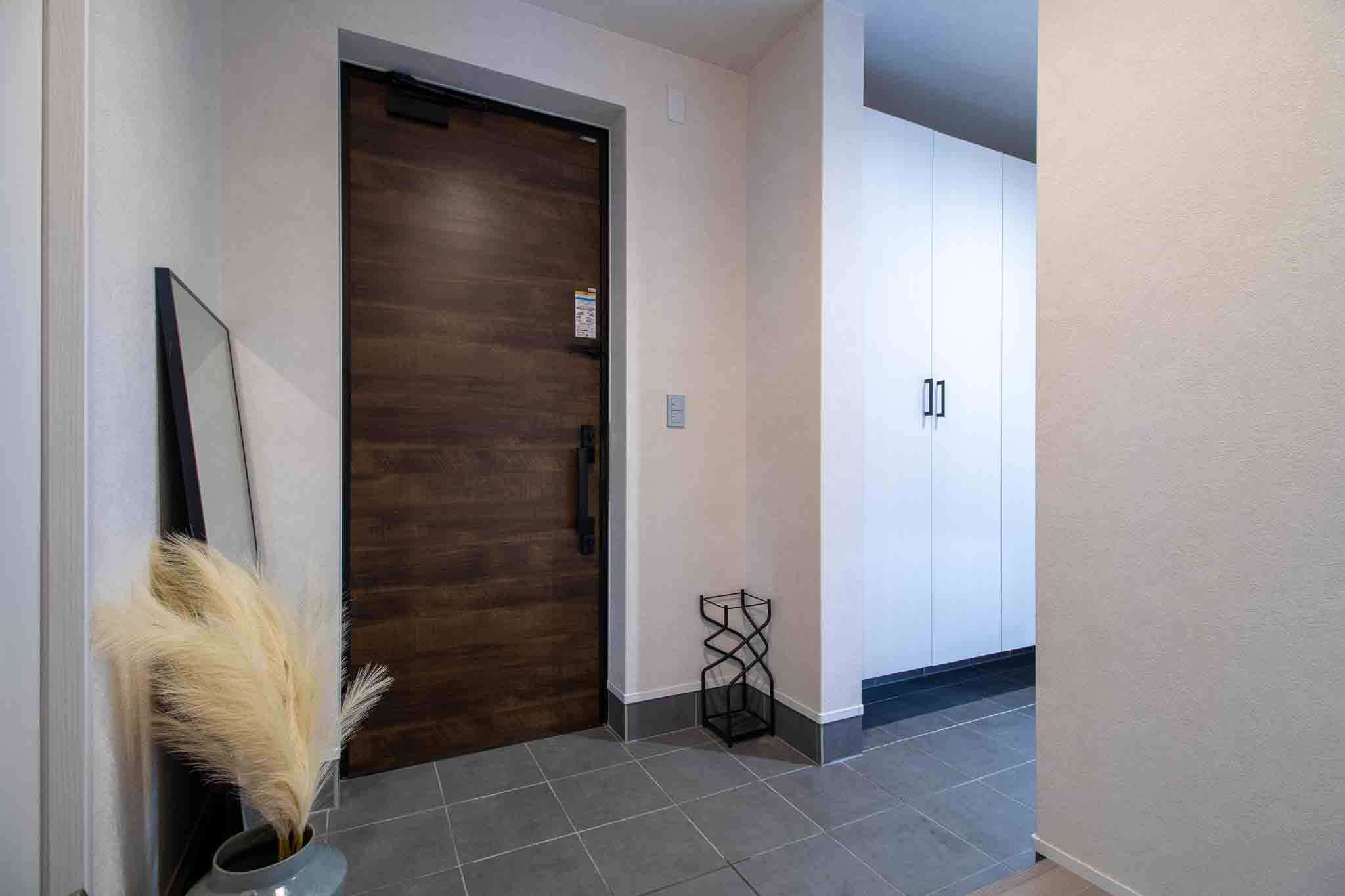 玄関:玄関にはファミリー玄関が設けられており、大容量のトールタイプの収納が特徴です。傘やベビーカー、園芸用品なども収納でき、玄関を常にスッキリと保つことができます。また、ダークトーンの木目柄の玄関ドアが高級感を加えています。
