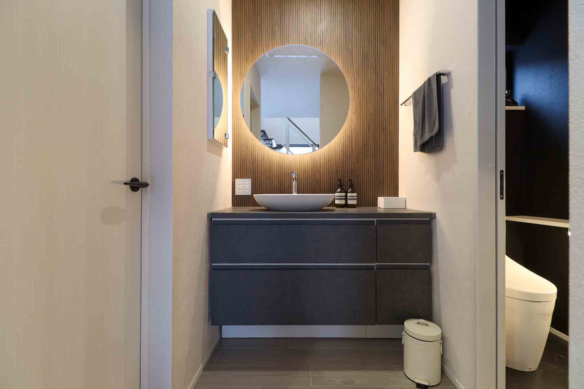 洗面スペース:造作の洗面化粧台が設置された独立洗面スペースは、家族のシャワー中にも気兼ねなく利用できます。おしゃれなデザインと埋め込み収納が、機能性と美観を両立させています。