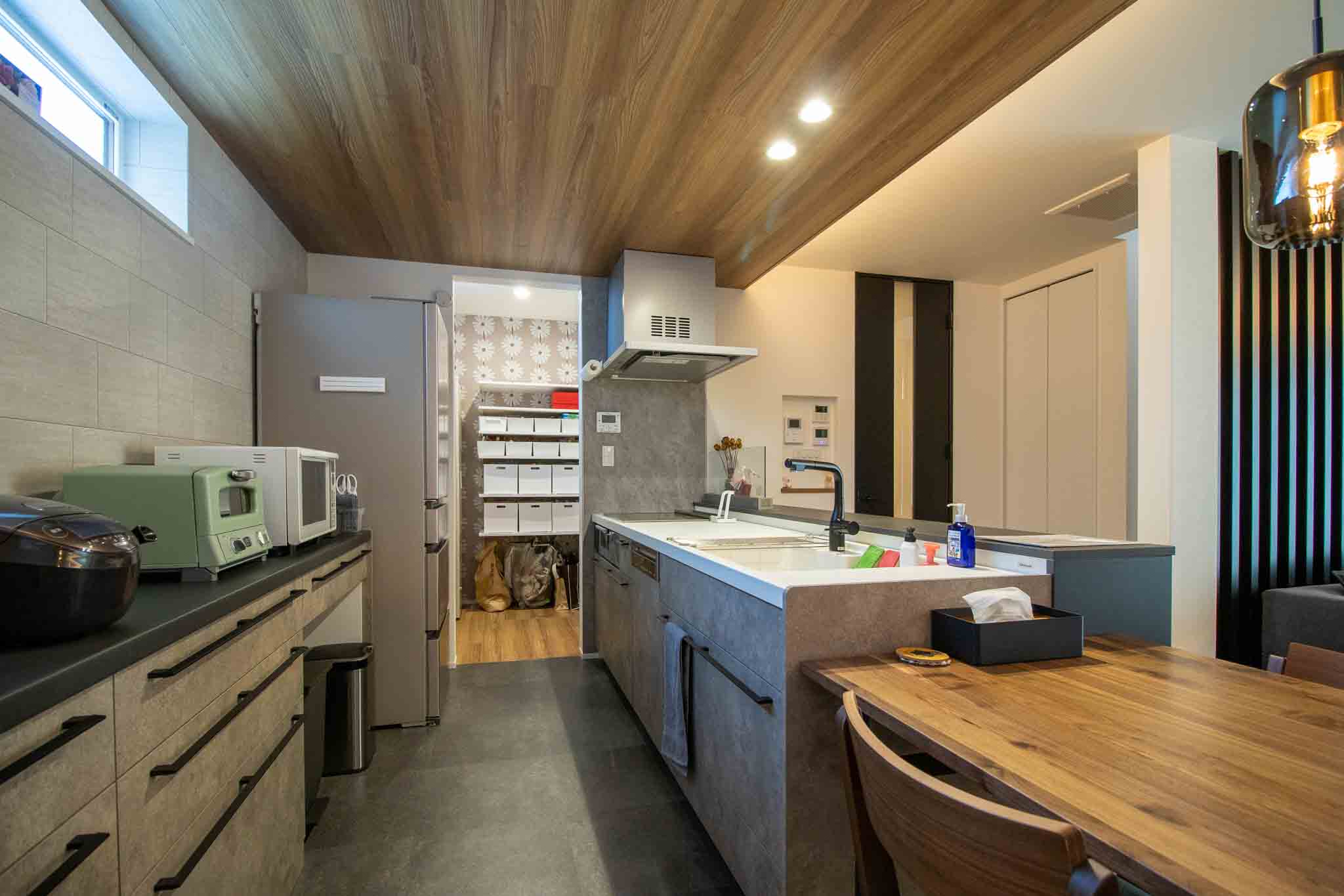 ダイニング:ダイニングには広々としたカウンターがあり、ワークスペースや学習スペースとしても利用できます。キッチンと横並びの配置で、家事効率が上がります。