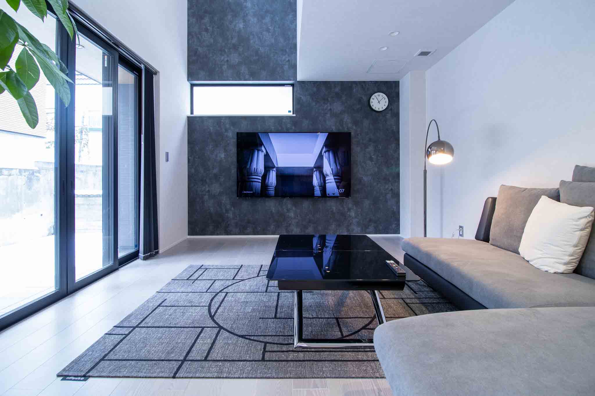 LDK:ゆったりと広がるLDKは、気品と重厚感を兼ね添えた家具たちも引き立てながら、ウッドデッキやポーチとつながってさらに開放的な印象を与える空間に仕上げています。