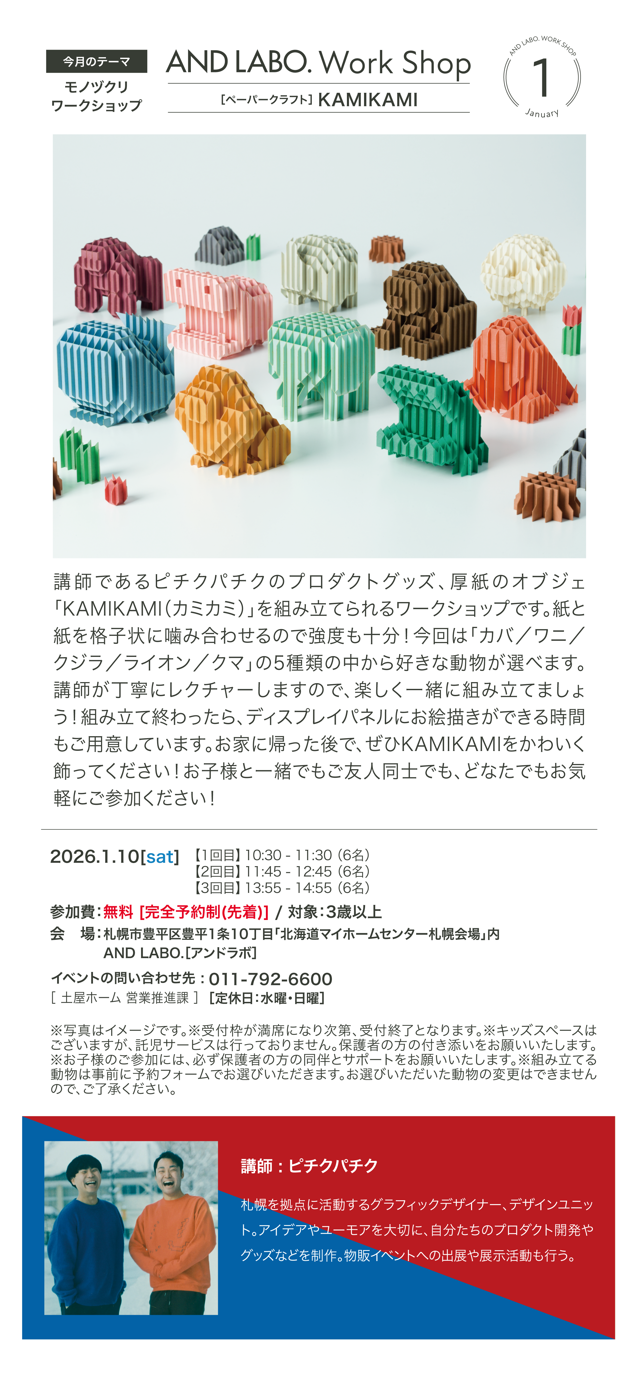 「ピチクパチク」様にご協力いただき【AND LABO. Work Shop [ペーパークラフト]KAMIKAMI】を実施予定!