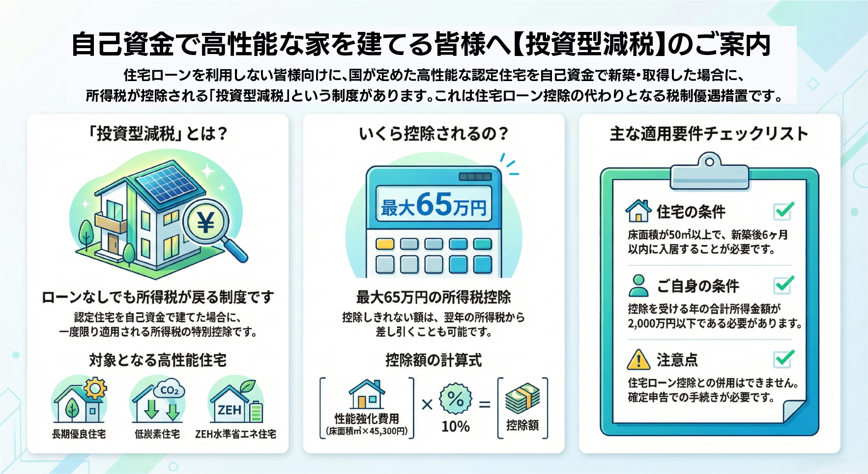 今回は、自己資金でマイホームを建てられる皆様向けの「投資型減税」について解説しました。長期優良住宅などの高性能な認定住宅を建築することで、最大65万円もの所得税控除を受けられる可能性がある、非常に魅力的な制度です。