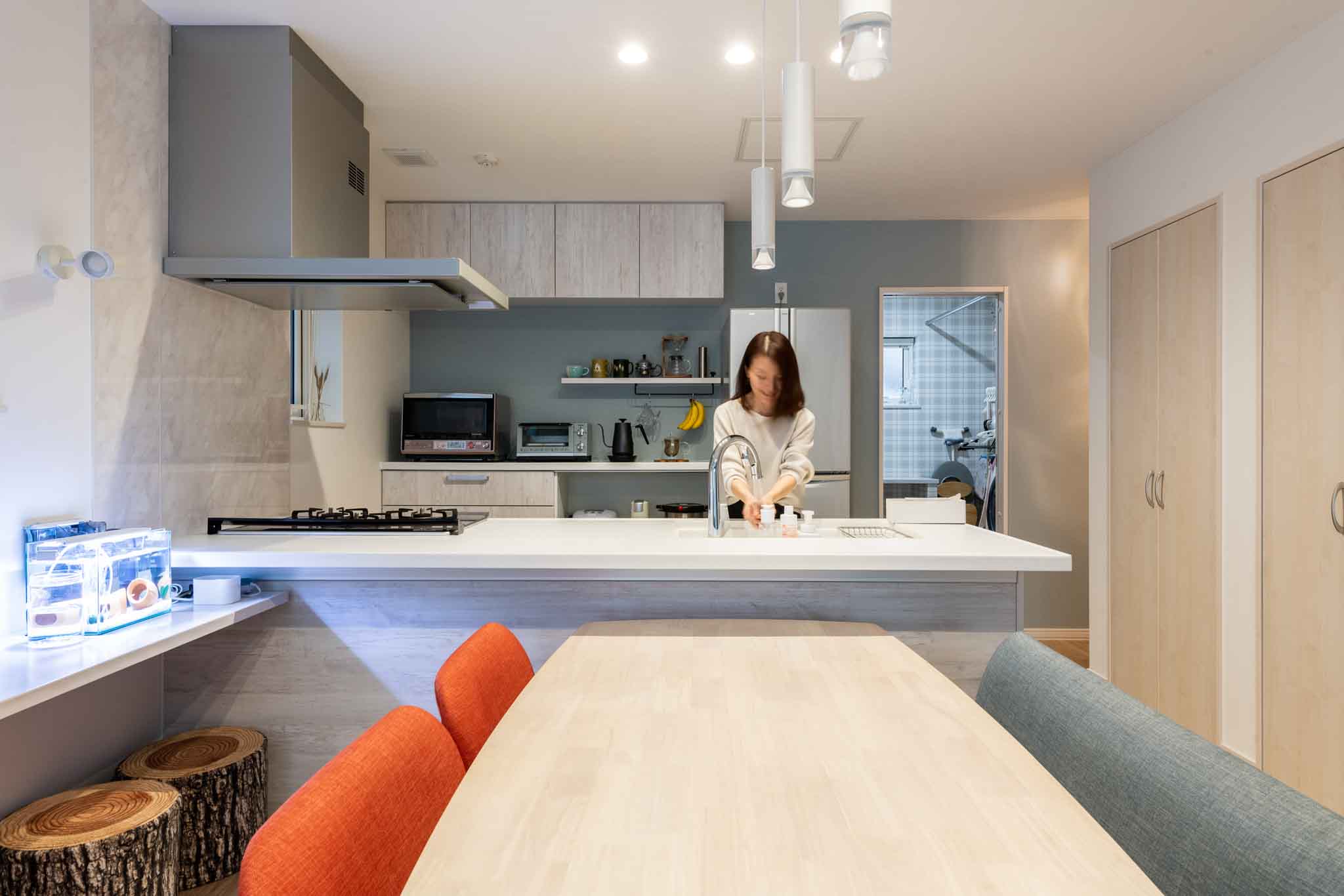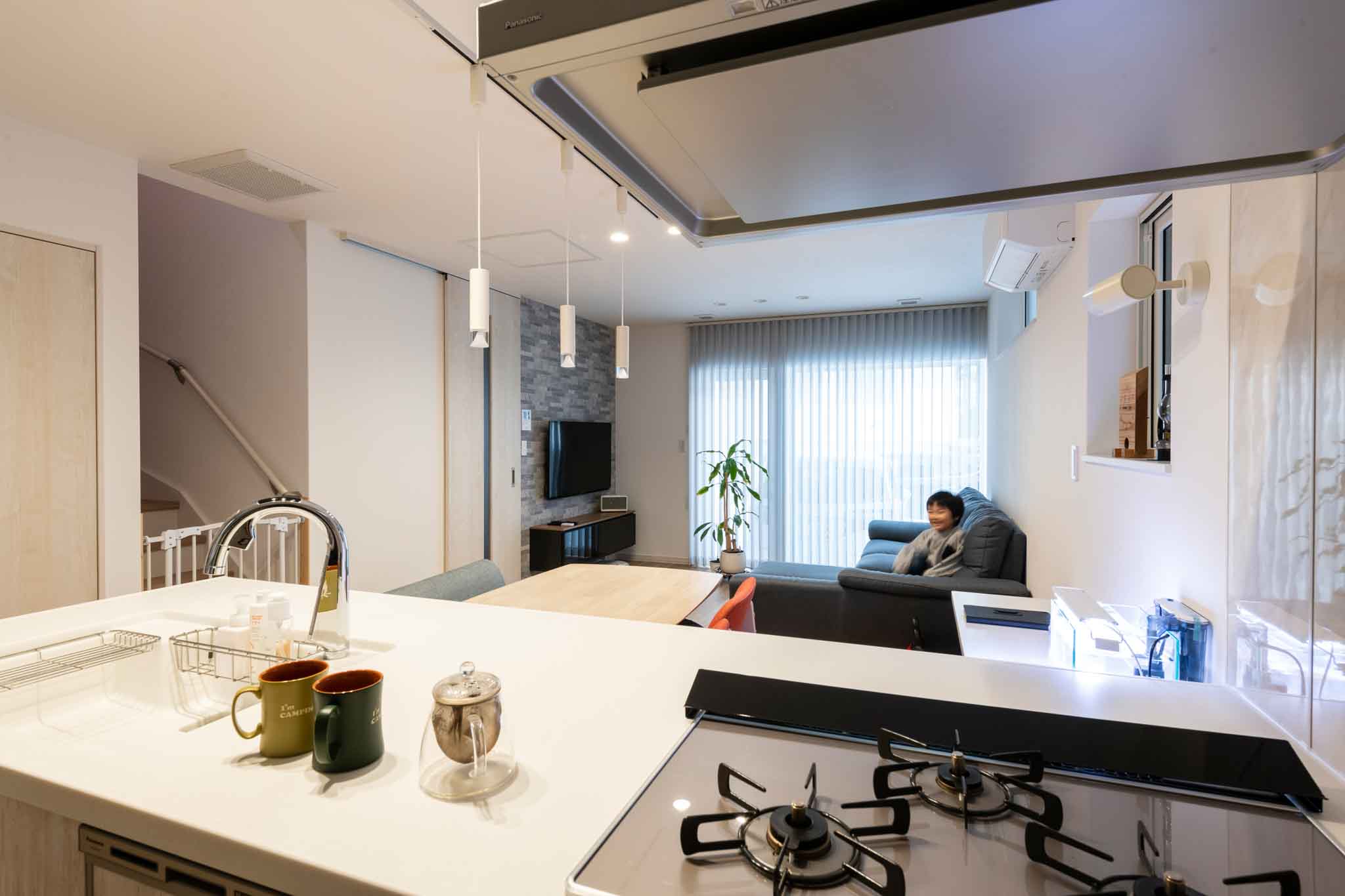 キッチン:調理中でもリビングやダイニングを見渡すことができるため、家族とのコミュニケーションが取りやすい設計になっています。