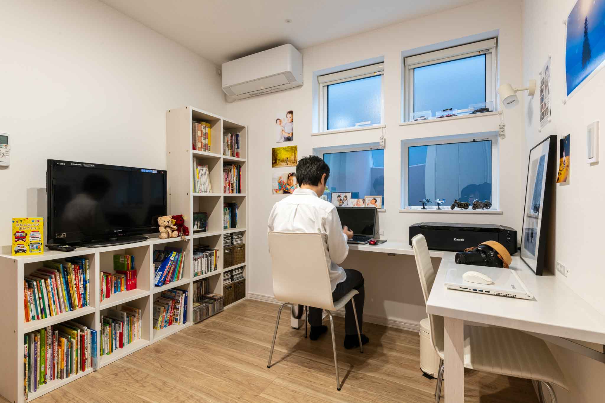 多目的スペース(2Fホール):ご主人様が優先されたのは2階の多目的スペースです。L字形カウンターと書棚が配置されたこのスペースは、趣味の写真撮影やパソコン作業を快適に行うことができる設計となっています。