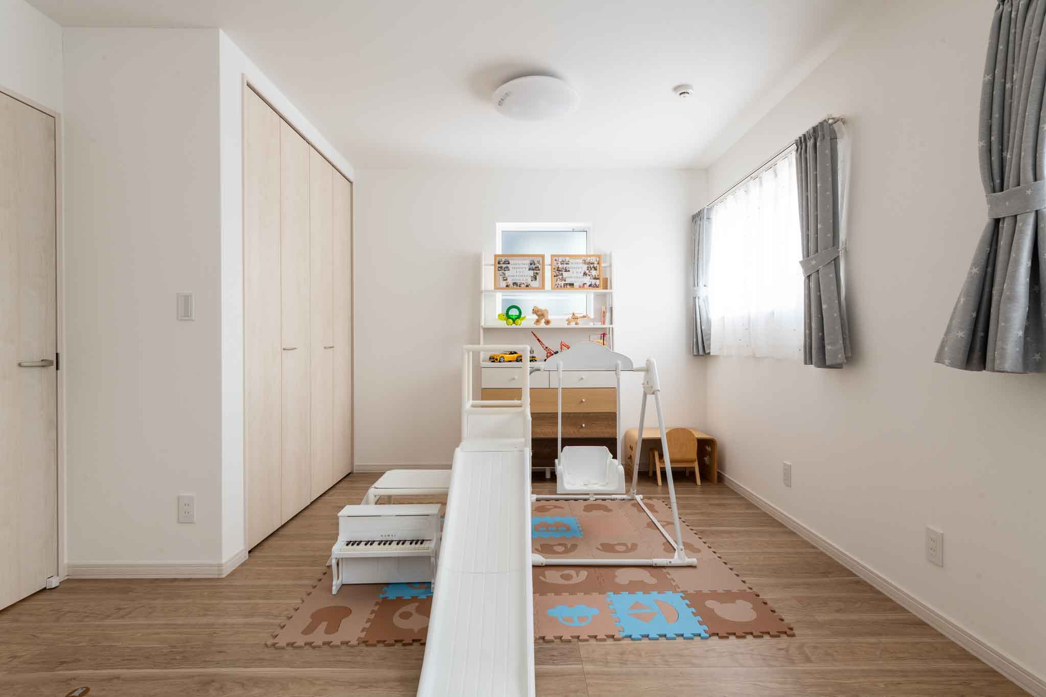 洋室:2Fの洋室は、「子どもが幼いうちはワンルームに」と考え、広々とした空間に遊具を配置しています。子どもの成長に合わせて、将来的には個室2室に仕切ることができます。
