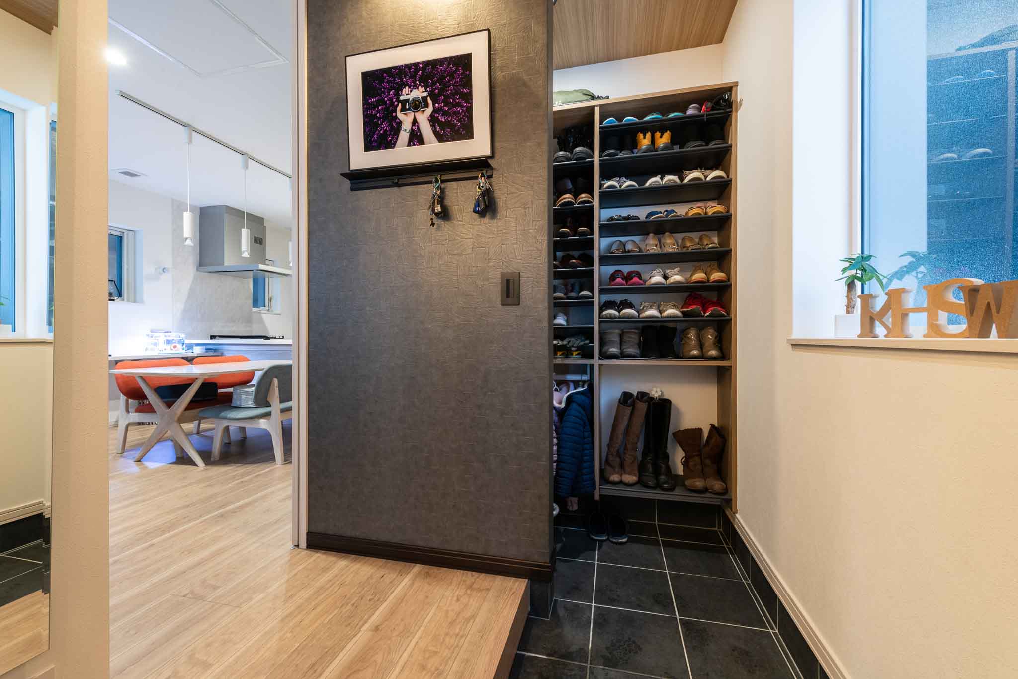 シューズクローク:ワイドなシューズクローゼットは、家族全員の靴をすっきりと収納できるだけでなく、統一感のあるデザインが玄関全体の美しさを引き立てます。特に奥さまにご満足いただいているポイントで、日々の生活の中での使いやすさが考慮されています。