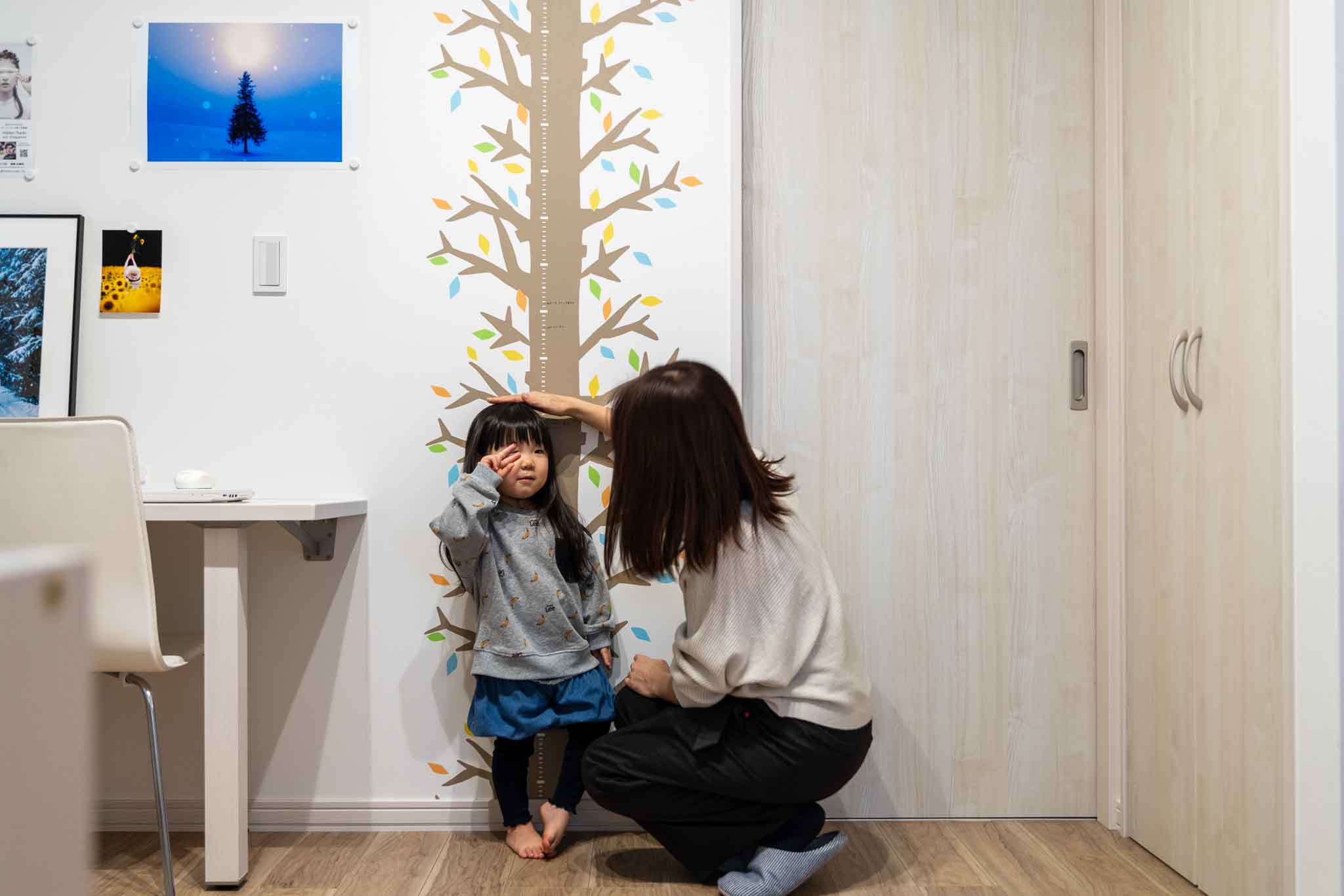 多目的スペース(2Fホール):カウンター横の樹木模様の身長計は、子どもの成長を実感するのに役立ちます。