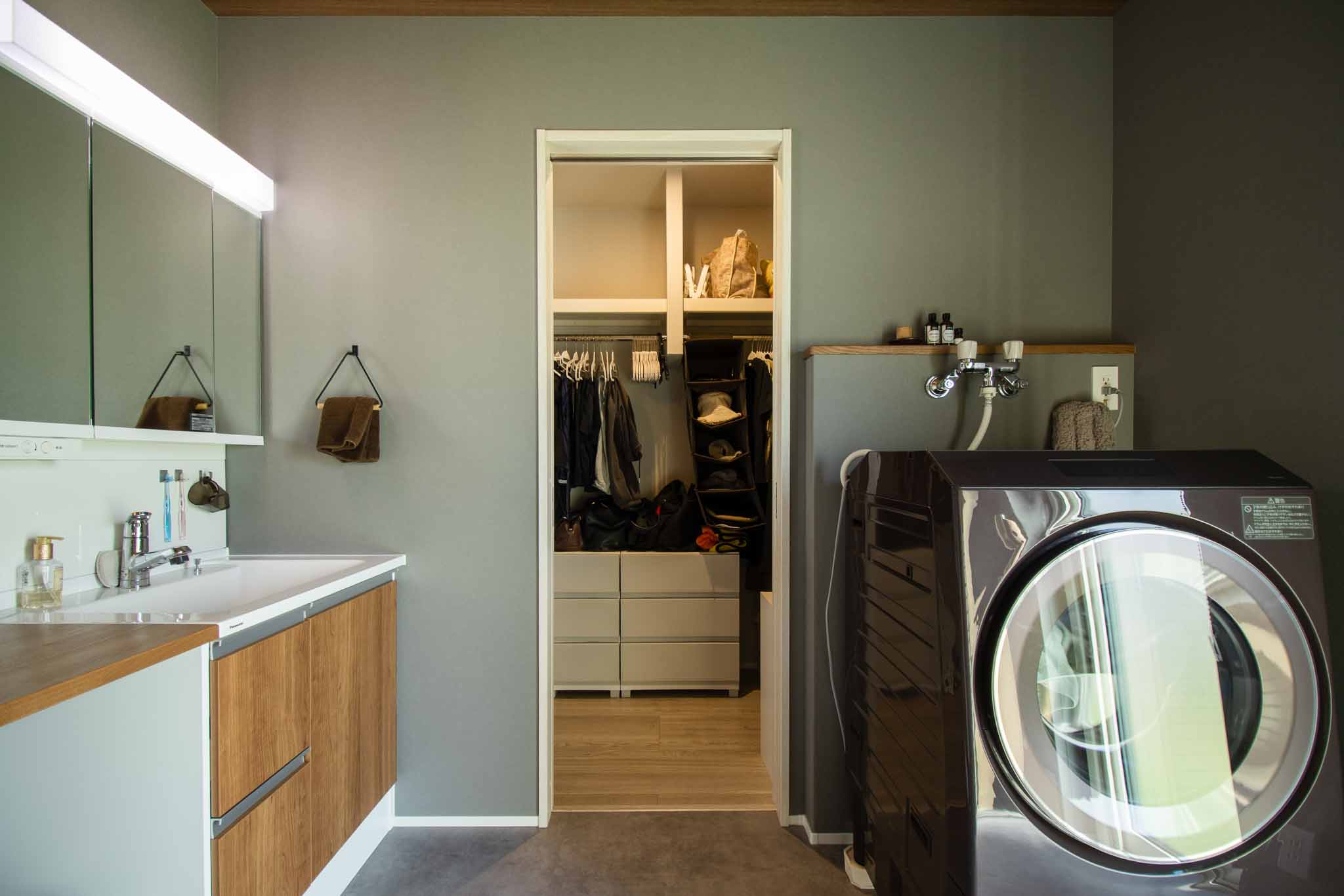 ユーティリティ:サウナ前のユーティリティには洗濯機や物干し用パイプが備わっており、ファミリークローゼットと連動して効率的な家事動線を確保しています。