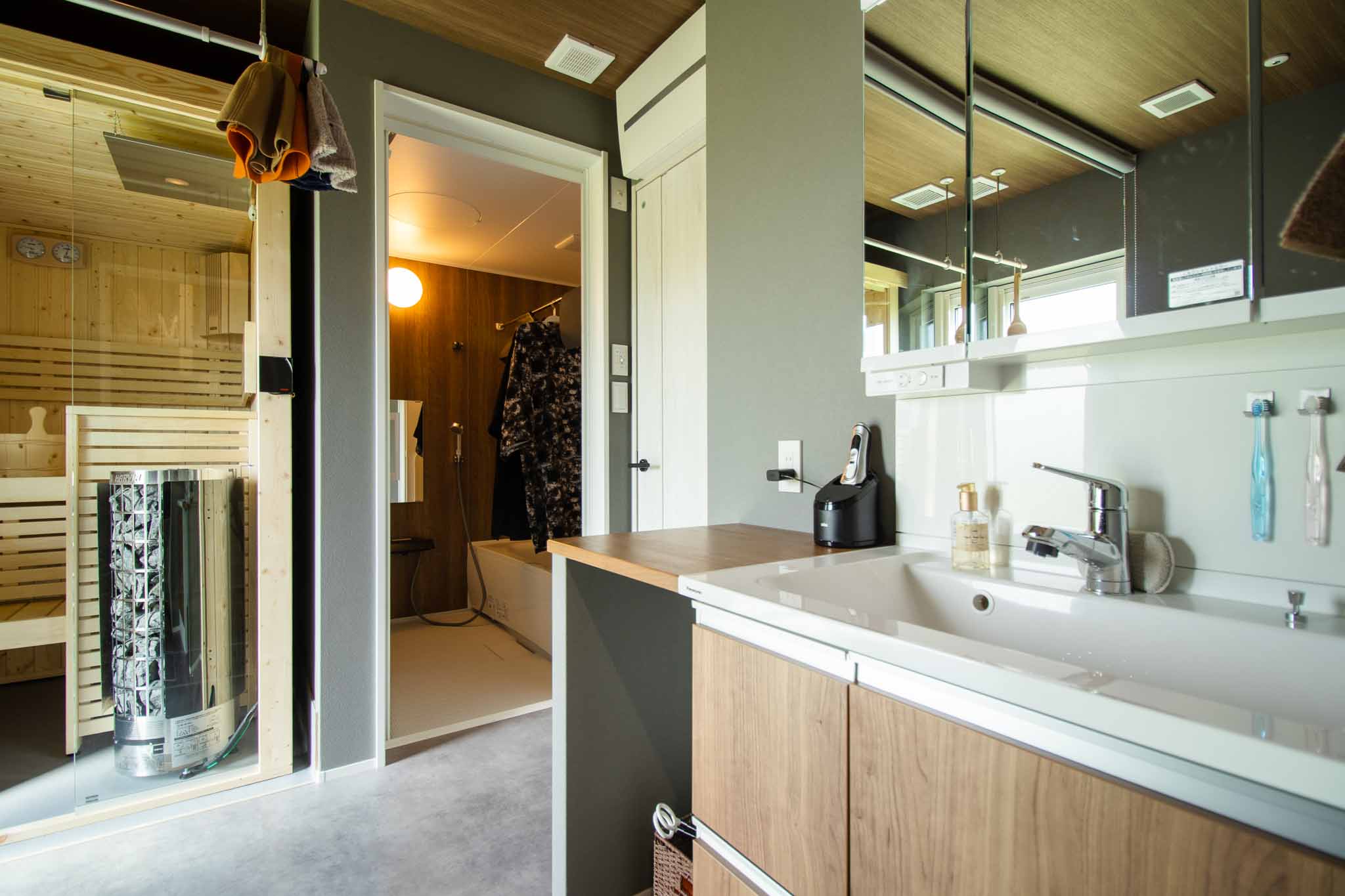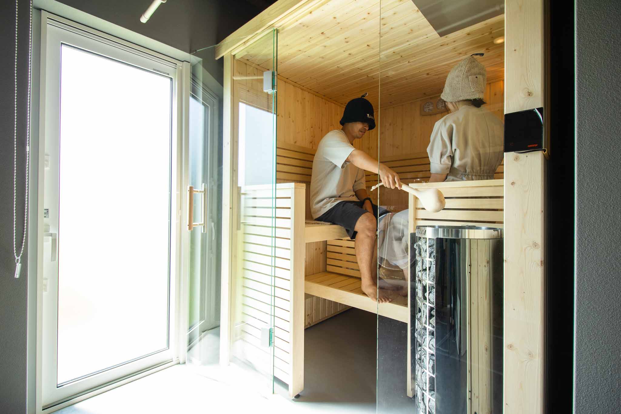 サウナ:オーナー様のご要望で実現した待望のホームサウナは、開放感のあるガラス扉とコの字形のベンチを備えています。ハルビア社のサウナストーブを採用し、施設クオリティの本格的な体験が楽しめます。