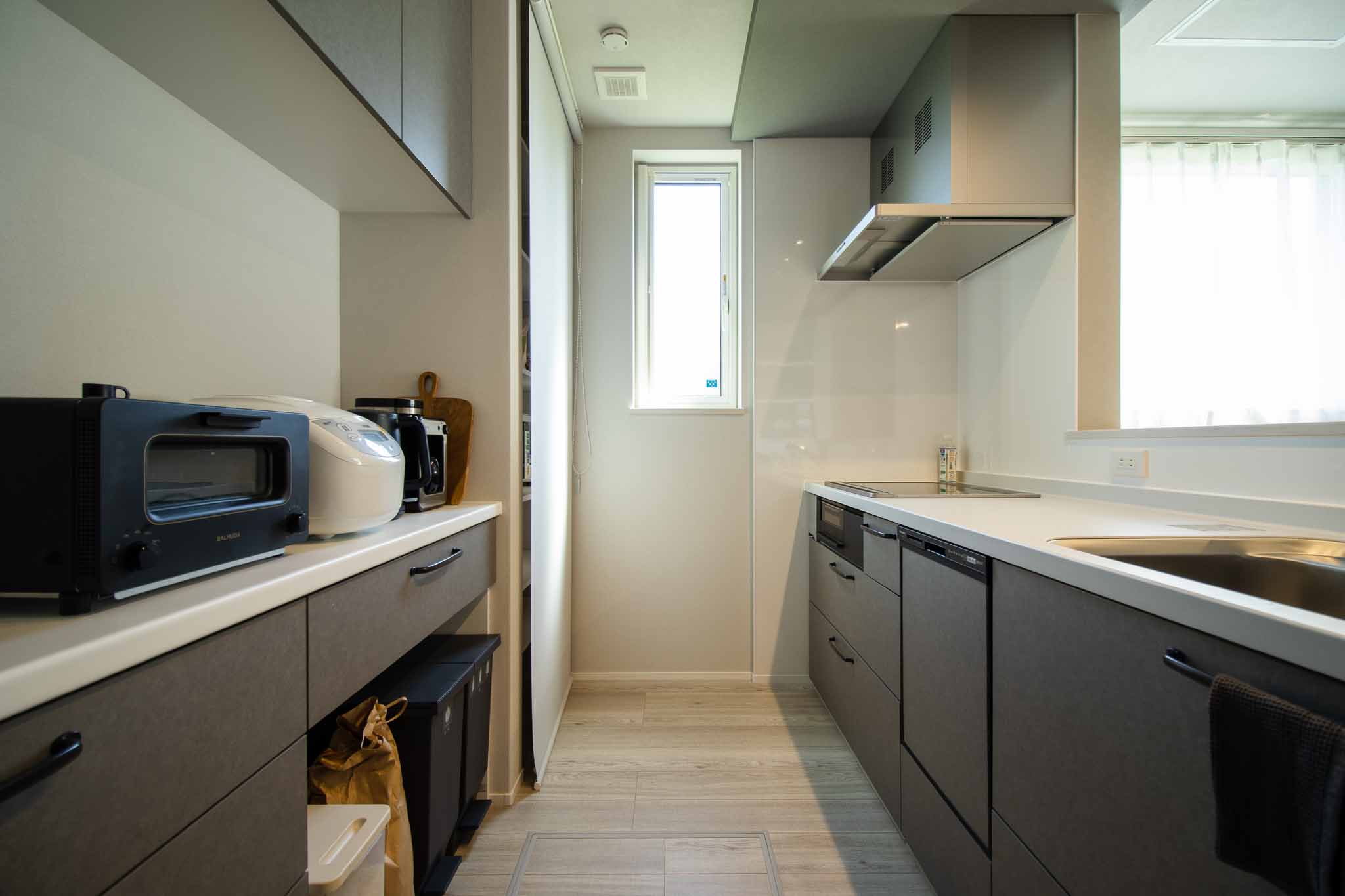 キッチン:背面にはパントリーやカップボードが並び、床下収納庫もあるため、収納力が抜群です。また全て目隠しが可能な扉付きで生活感が表に出にくいこともポイントの一つ。