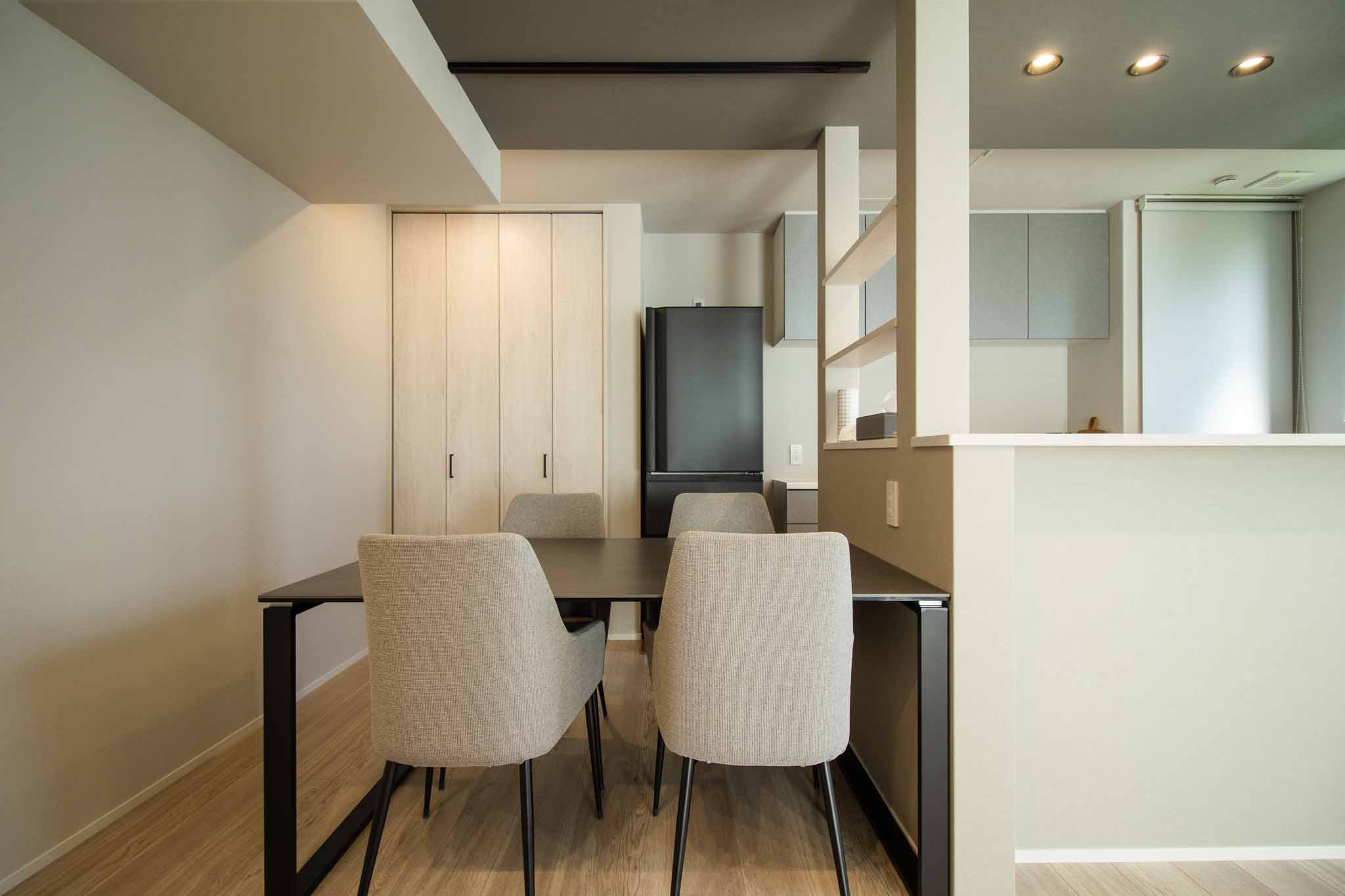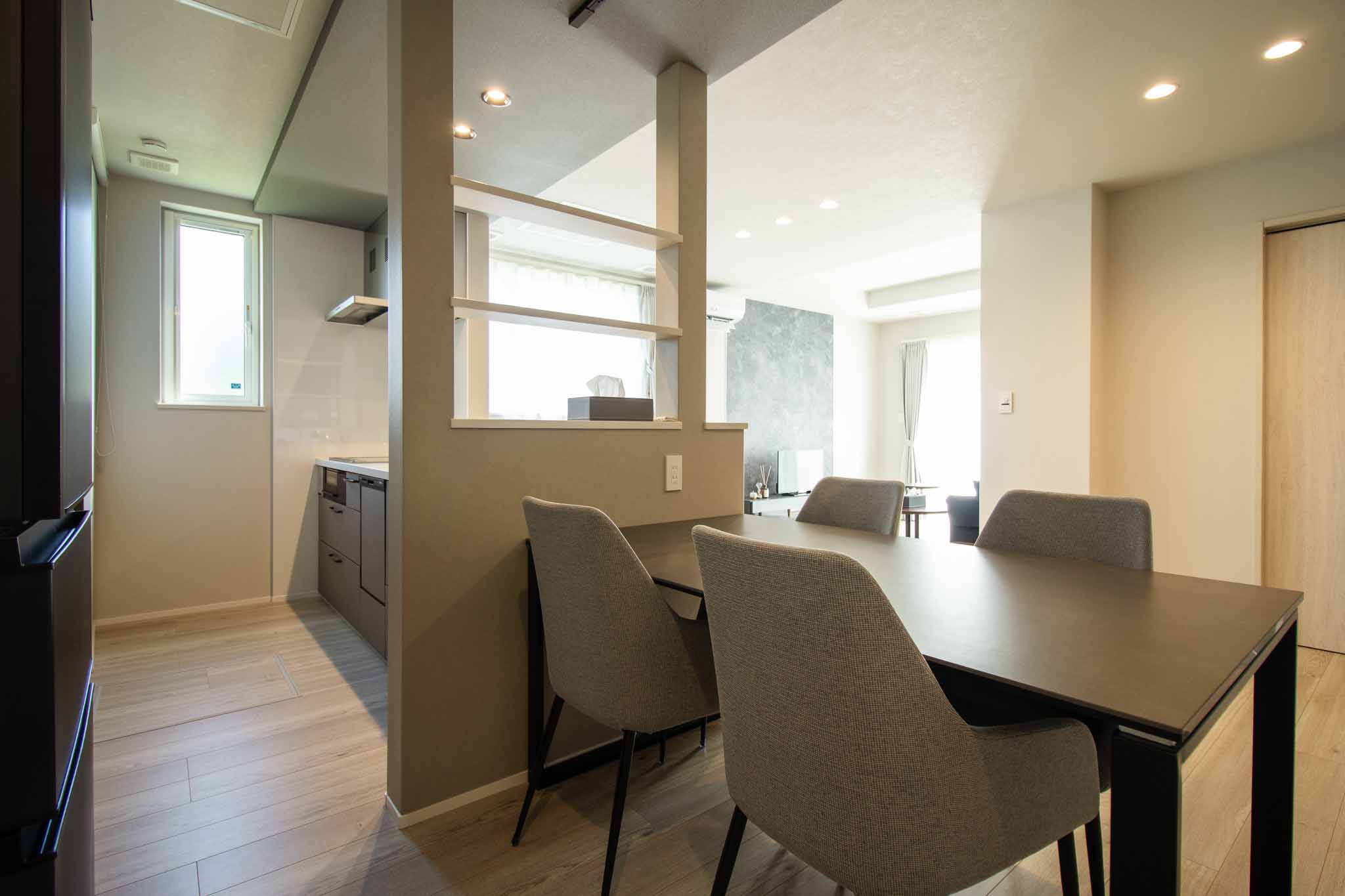 ダイニング:間仕切り壁をインテリア棚としてデザインし、空間の広がりを演出します。視線が抜けることで、実際よりも広く感じられる効果があります。