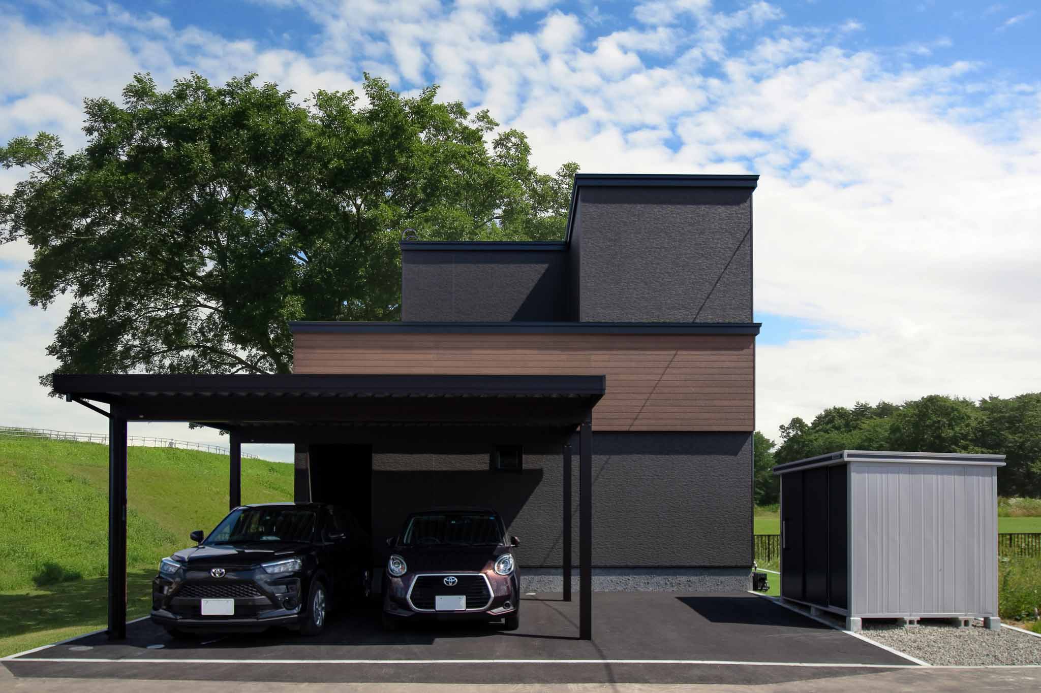 外観:外観はブラックを基調とし、木目外壁でアクセントを加えたシンプルかつ重厚感のあるデザイン。前面は無窓の設計で、スタイリッシュな外観とともにプライバシーをしっかりと確保しています。