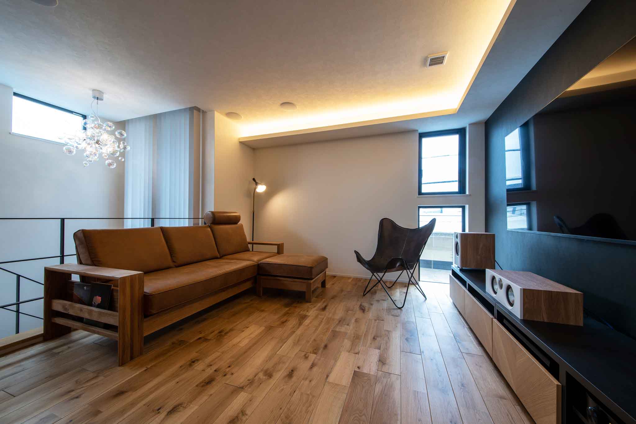 2Fリビング:洗練されたデザインのリビング。音響設備としてリビングの天井にスピーカーを設置しています。