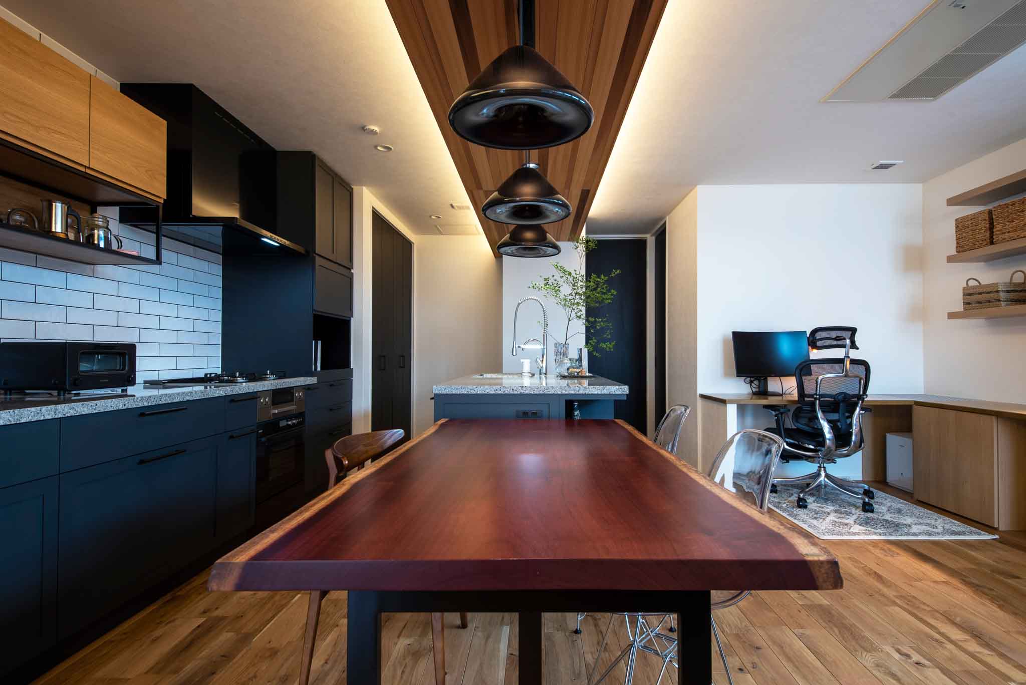 2Fダイニング:給湯室キッチンと横並びのダイニング。ダイニングテーブルは無垢のリアルな質感で家全体のコーディネートと合わせて、おしゃれな雰囲気を醸し出しています。