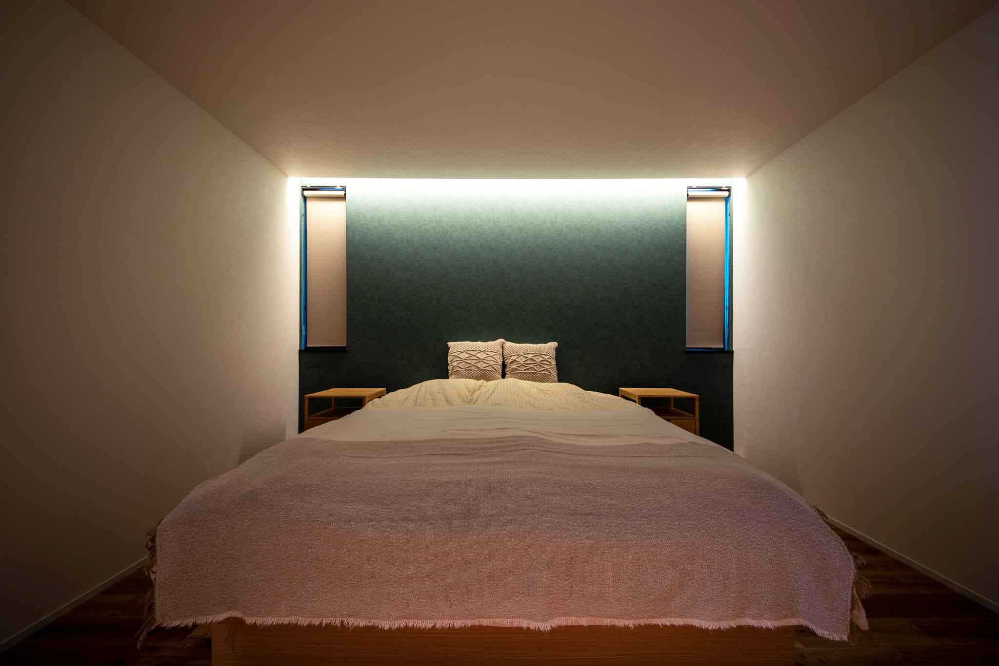 1F寝室:1Fにあるベッドルームの照明は間接照明のみ。ベッド両脇に窓をシンメトリーに配置しデザインにも配慮しています。