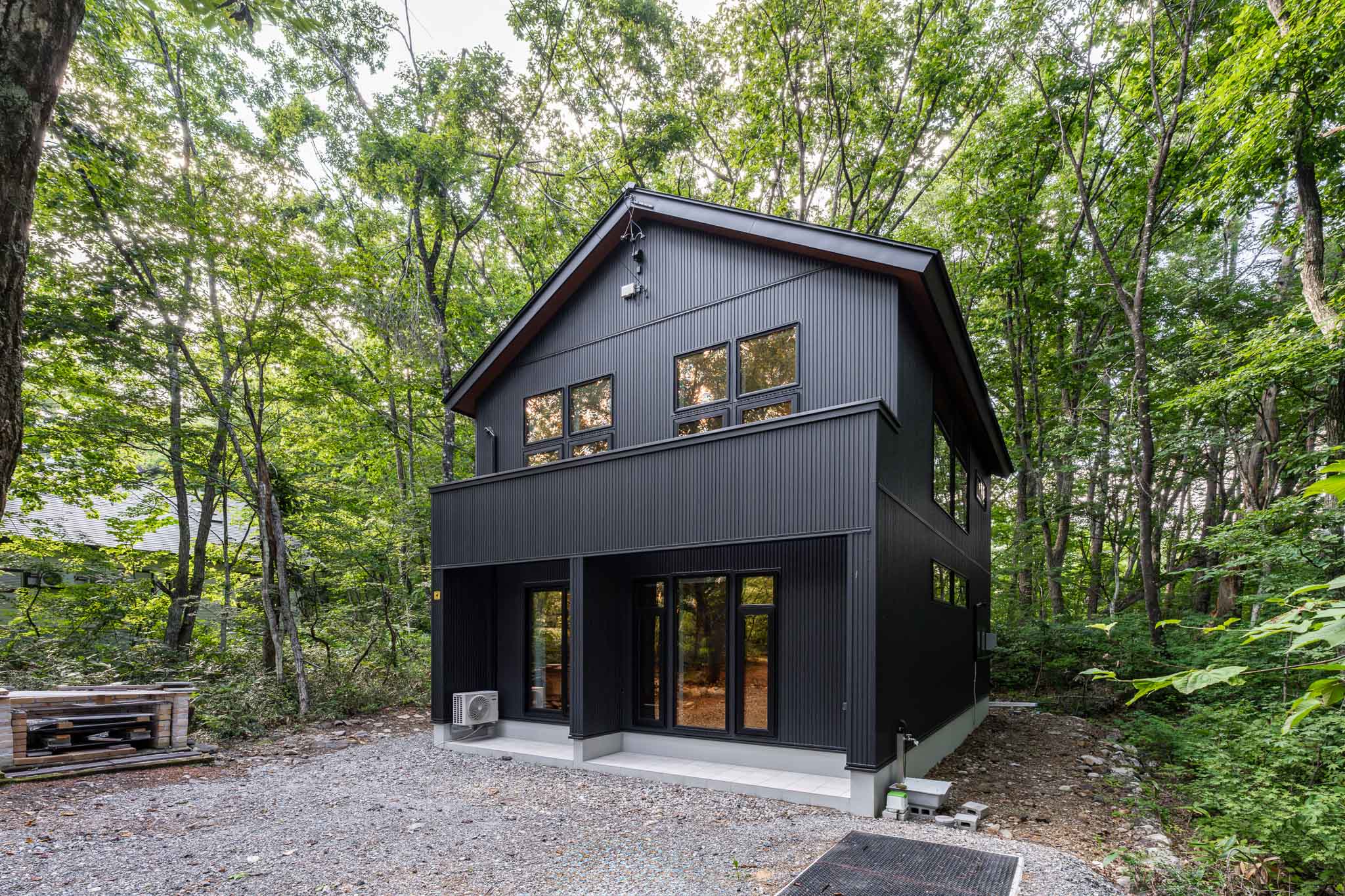 外観:天然石を小端積みしたファサードは、訪れる人々を圧倒する存在感。邸宅に降り注ぐ木漏れ日が情感を引き立て、自然と調和した美しいデザインです。