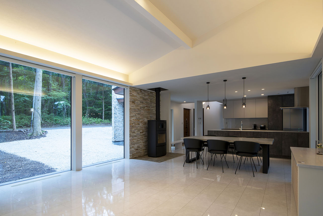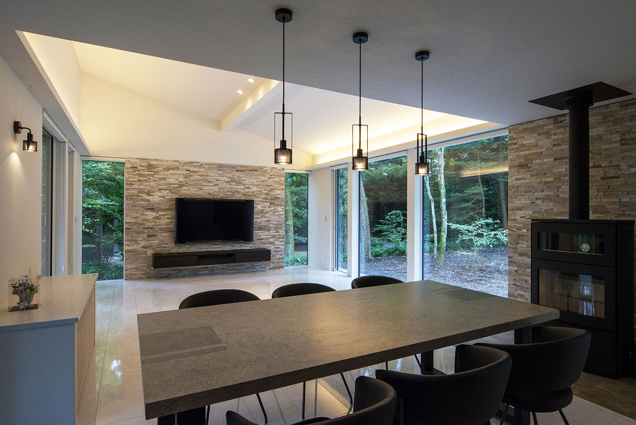 リビング:森との一体感を感じられるアウトドアリビングの趣があり、大きな窓から四季折々の景色を楽しむことができます。ピザが焼けてポトフも作れる機能的な縦型暖炉を採用しました。