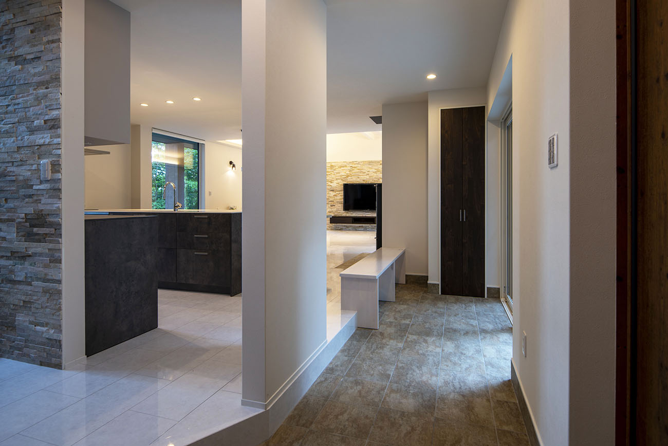 玄関:玄関からホール、LDKまで続く開放的な眺めが魅力です。高い天井が一層広々とした空間を演出します。