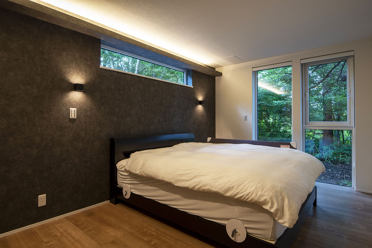 寝室:大きな開口部から自然光が降り注ぐ寝室は、朝も夜も心地よい安らぎの空間です。