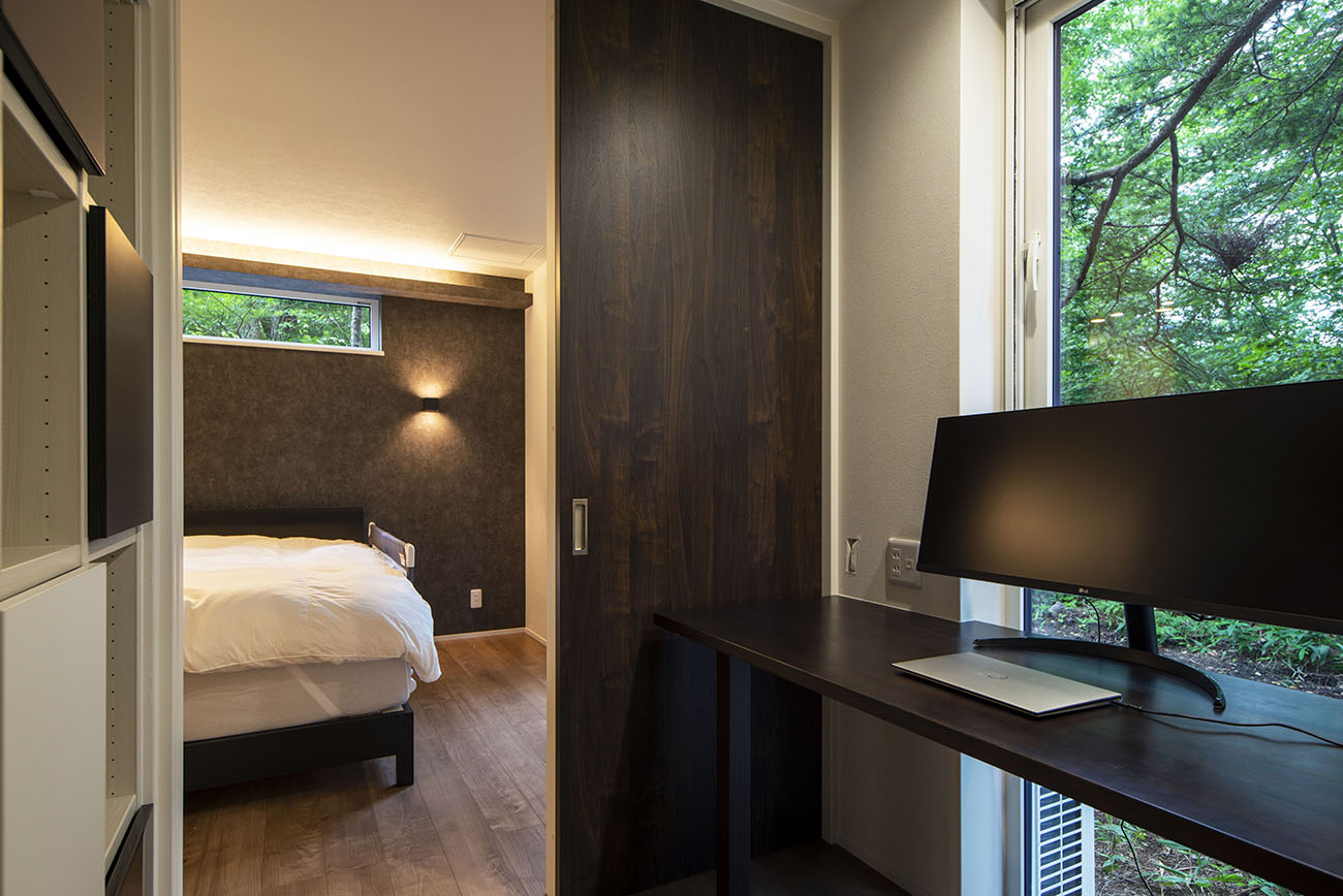 書斎:1F寝室に続くオーナー様の書斎。フレキシブルなワークスペースとして設計されており、カウンターや収納スペースが充実しています。大きな窓から自然光がたっぷりと差し込み、快適で集中しやすい環境です。