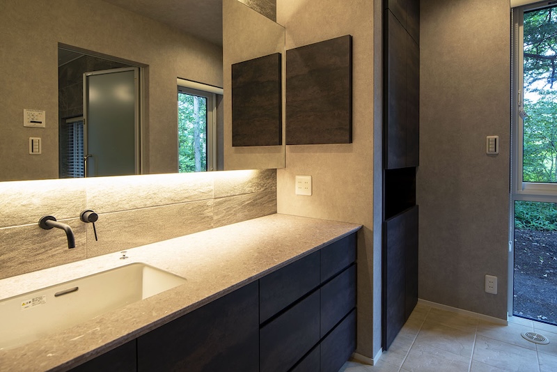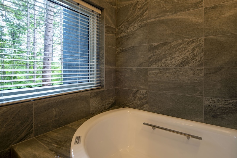 浴室:大きな開口部を設けて緑を取り込み、露天風呂のような開放感を生む浴室です。