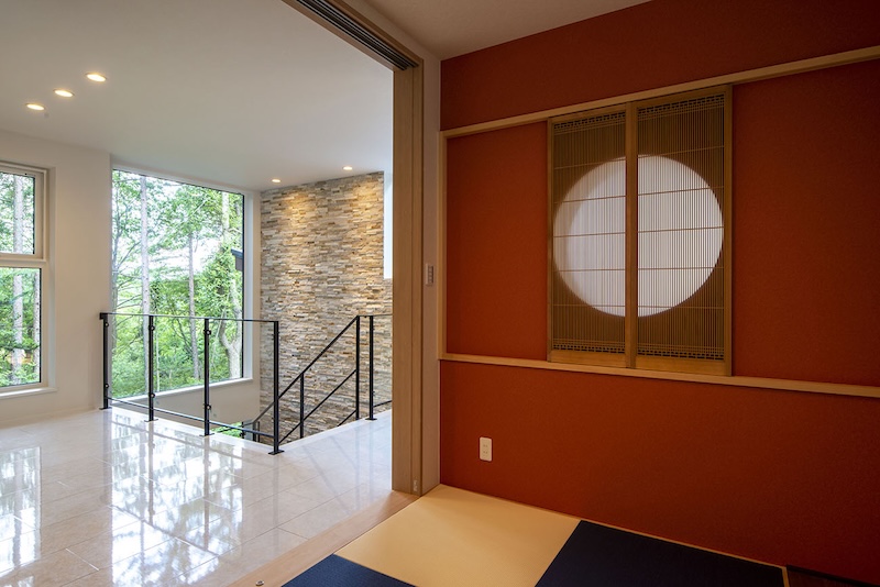 和室:書院窓など伝統美とモダンテイストを融合させた和室は、お茶やお花、書道を愛する奥様の趣味の部屋として普段から使用されています。また、ゲストルームとしても利用できる設計となっています。
