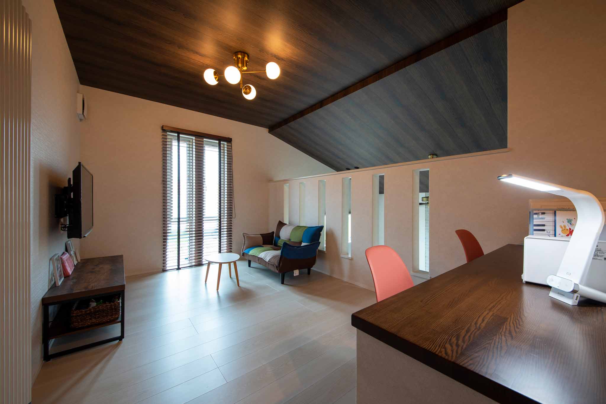 セカンドリビング:2階に設けられたセカンドリビングは、吹き抜けを介して1階とつながり、一体感のあるデザインになっています。腰壁にはスリットがあり、1階と2階の様子をお互いに確認できる設計です。セカンドリビングは、お子さまが成長し、友達と語らう場になることを想定しており、家族全員が快適に過ごせる場所です。
